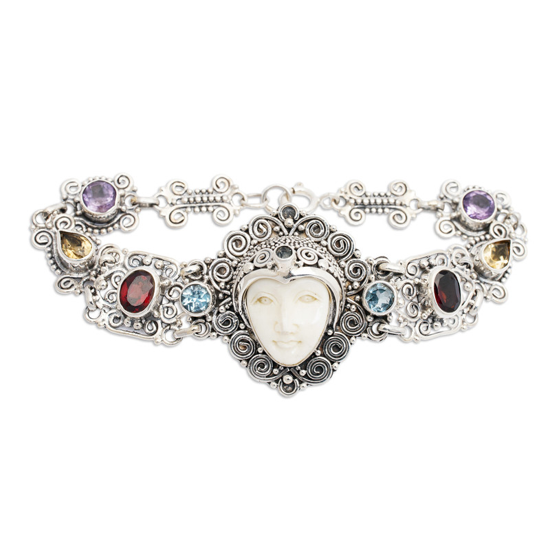 Backed by our 100% Happiness GuaranteeOver 6 carats of gemstones grace this elegant link bracelet from Bali's Dewi Putera. Amethyst, citrine, blue topaz and garnet flank a beautiful center pendant hand-carved of smooth cow bone. The dreamy face, crowned by another faceted blue topaz, seems to gaze serenely into the distance. Ornate Balinese-style silverwork completes the design.