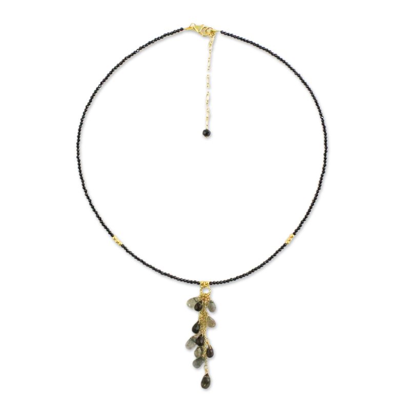 Backed by our 100% Happiness GuaranteeNatural labradorite alongside black onyx and smoky quartz capture the mystical gleam of a beautiful cavern, decorating the pendant of this necklace from Thailand. Sukanya Thongperm designs the necklace, featuring a length of petite onyx beads that encircle the neck. Links and beads of 18k gold plated sterling silver complete this accessory.