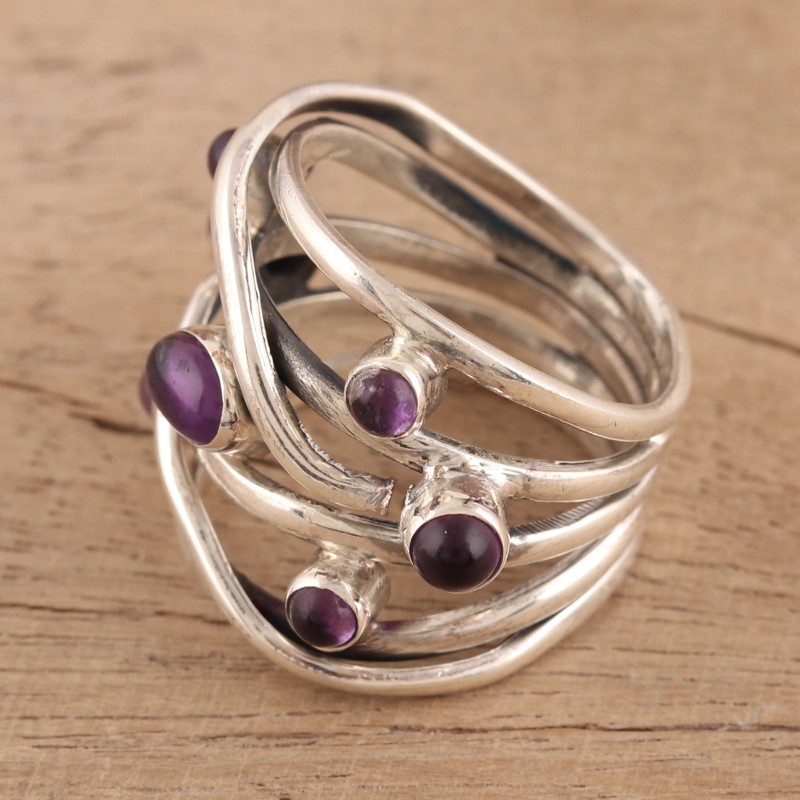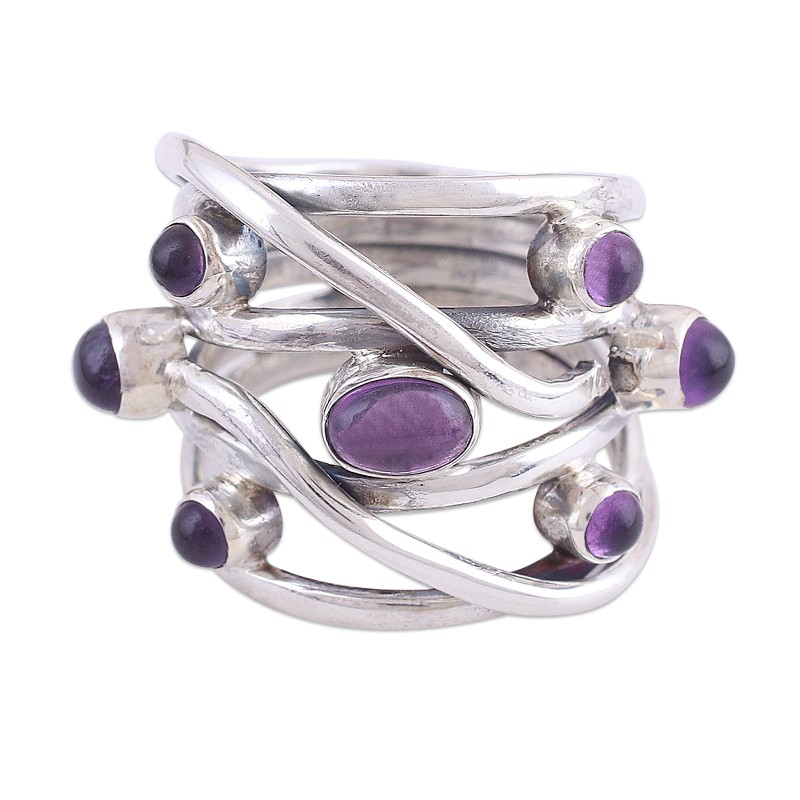 Backed by our 100% Happiness GuaranteeSterling silver ribbons create an intertwining pattern around the finger in this cocktail ring by Parul in India. She chooses seven cabochons of elegant purple amethyst to adorn the front of the elaborate ring.