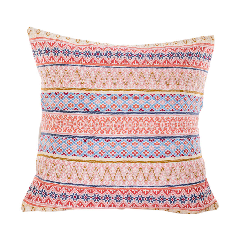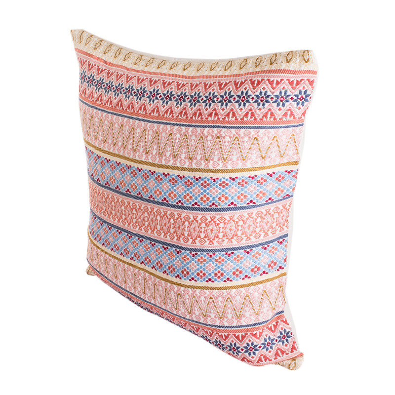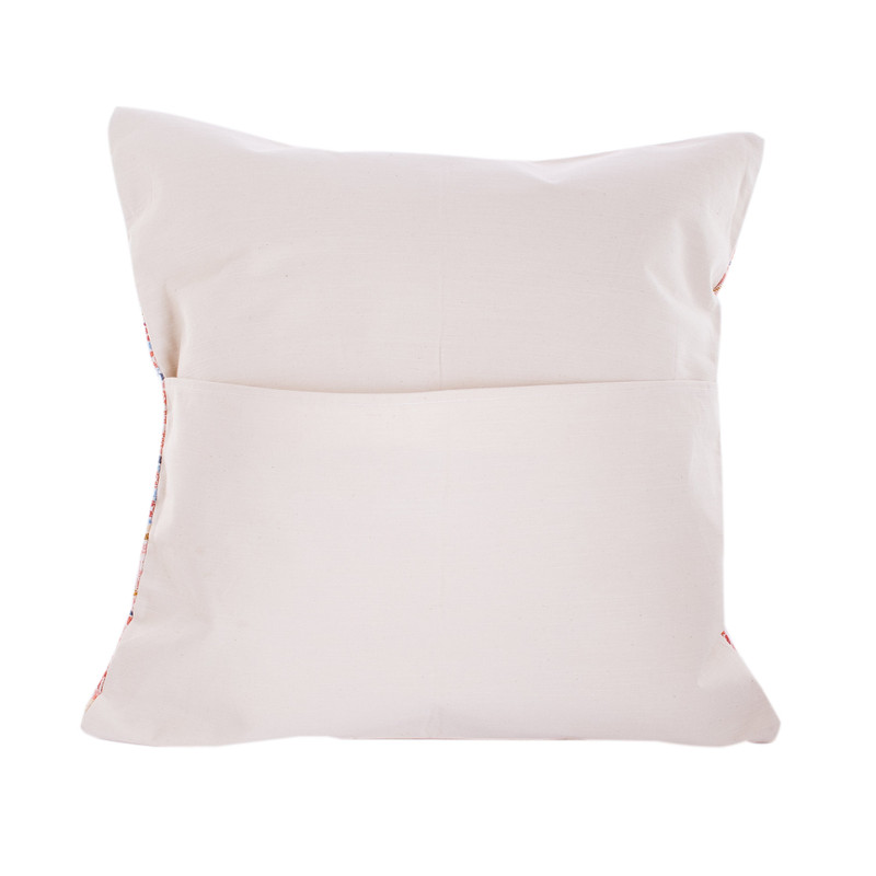 Guatemalan artisan Mirian Otzin handlooms this lovely cotton cushion cover with artisanal techniques traditionally reserved for men. Inspired by her beloved country, Mirian designs this charming creation in different colors and patterns, with beige, pink, strawberry, blue and cyan tones. The back features an elegant opening to insert the cushion.