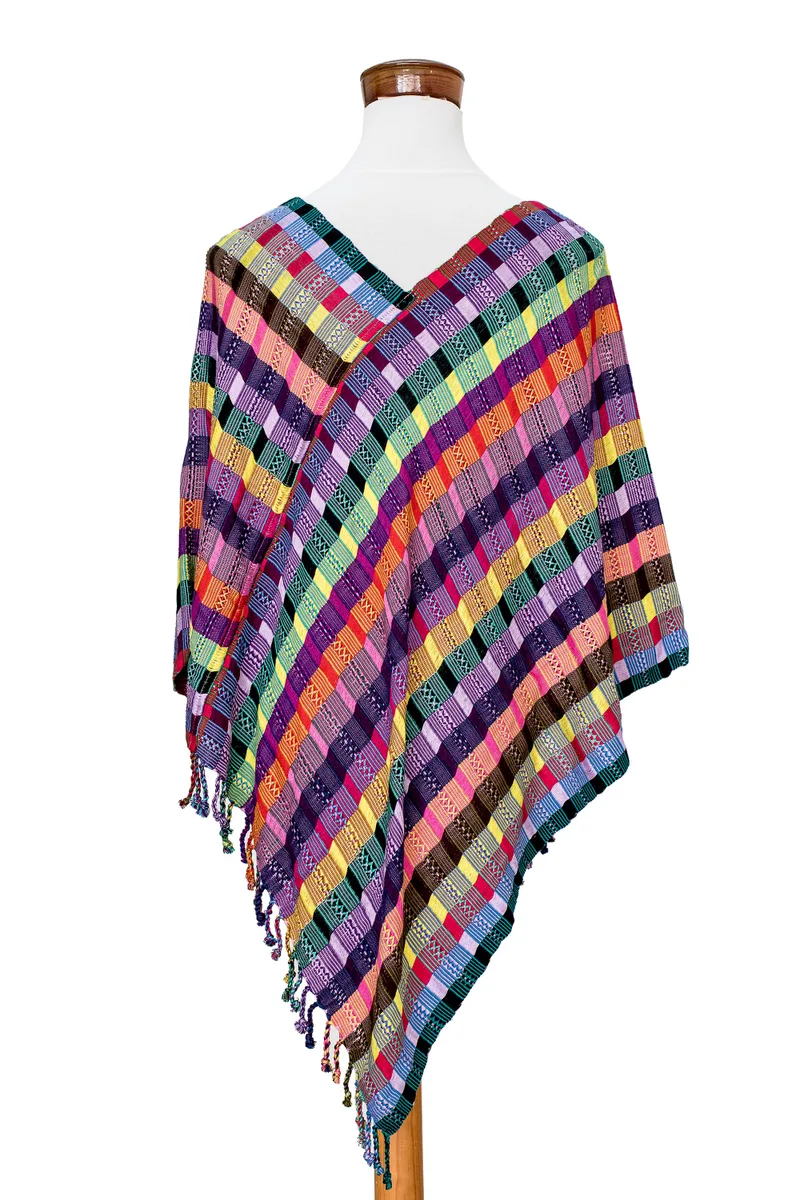 Delivery EstimateReady to pair with anything you wear, this colorful poncho is a fiesta unto itself. Elena Ixtamer designs the all-cotton poncho, which is woven on a traditional backstrap loom. Hand-knotted fringe accents the edges.