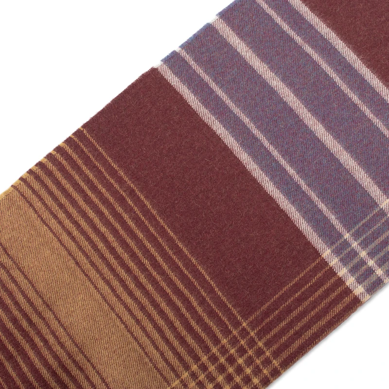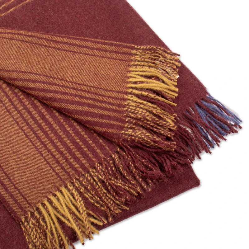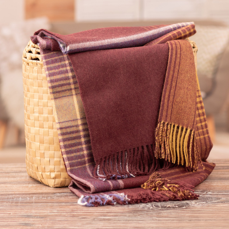 Bold and beautiful, this throw blanket from Peru combines stripes of honey, iris, and snow white over a maroon body. Nataly and Alberto present the design, which is woven from luxuriously soft baby alpaca, the fine fleece from the season's first shearing.