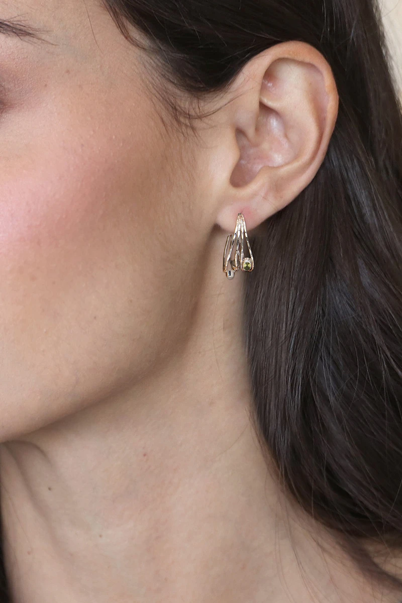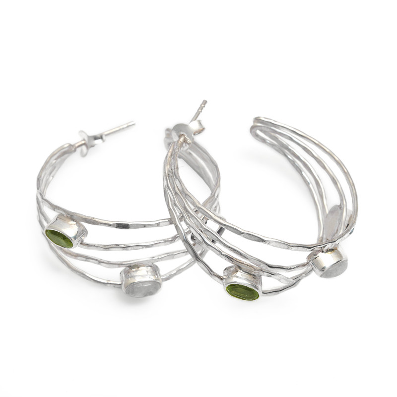 Backed by our 100% Happiness GuaranteeStones of peridot, rainbow moonstone and garnet adorn the front of this pair of multi-strand half-hoop earrings. Indonesia's Ketut Sulastri designs these brilliant earrings, handcrafted from hammered sterling silver.