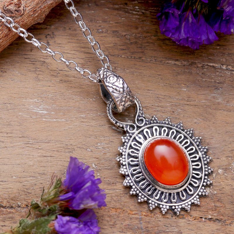 Alok Jain presents an exquisite necklace full of India's dapper charm. Around a fiery cabochon of natural carnelian—in an oval cut—dot and wire patterns of sterling silver crown the accessory with ethereal and shining beauty.