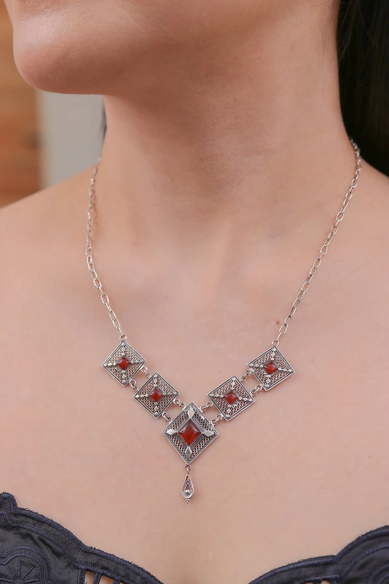Be the goddess of your world with this sublime creation from the Thai region. Made with a palatial aura to captivate everyone, Michael Krainer's sterling silver necklace boasts a regal vibe in each of the diamond-shaped pendants that form this majestic accessory. Intense carnelian cabochons add a radiant red hue to the piece, representing the courageous and fiery energies that live inside you.