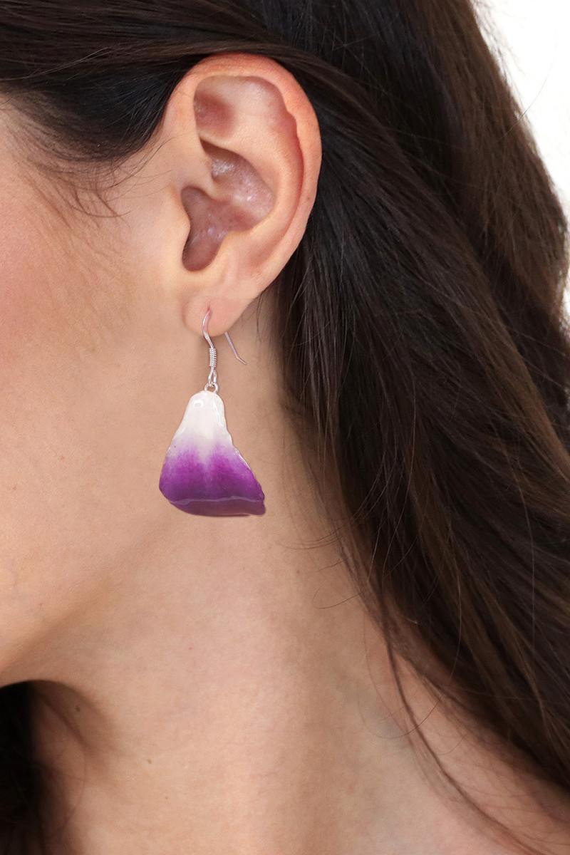 Delicately tinted, orchid petals dance on sterling hooks. Danai encases natural flowers in resin to preserve their ephemeral beauty. The earrings hang from sterling silver wires.