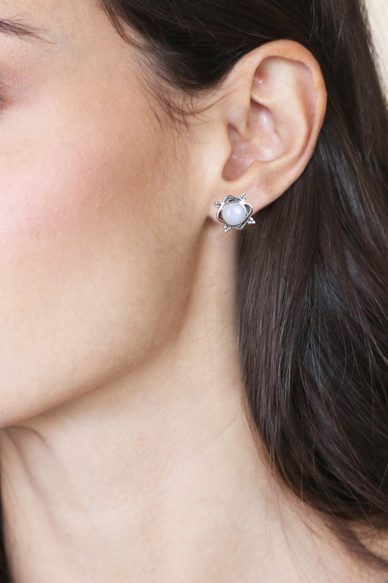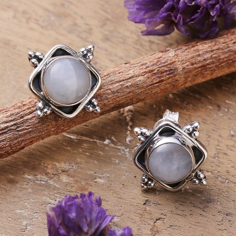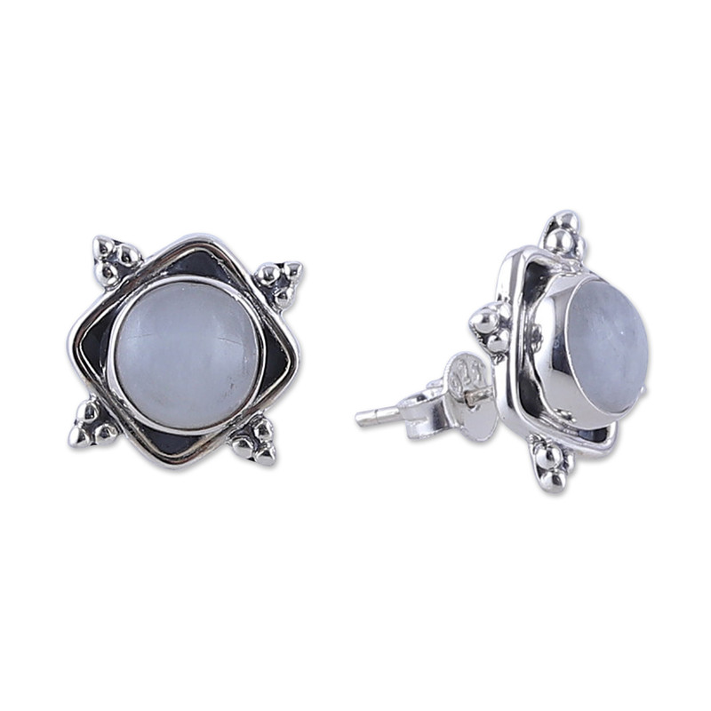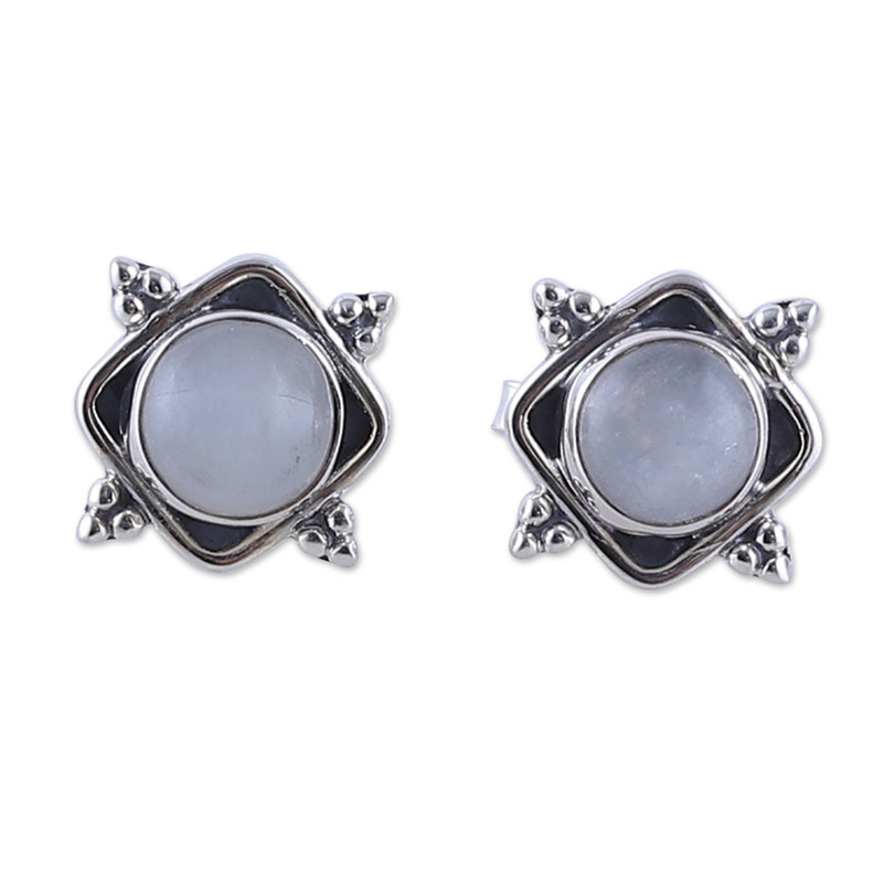 Defined and exquisite forms compose this sterling silver pair, crafted with India's regal splendor. Presented by Shanker, these classic button earrings evoke an era of magnificence through their polished and oxidized details. At the center, natural rainbow moonstones add misty sparks, symbolizing harmony.