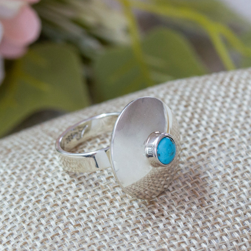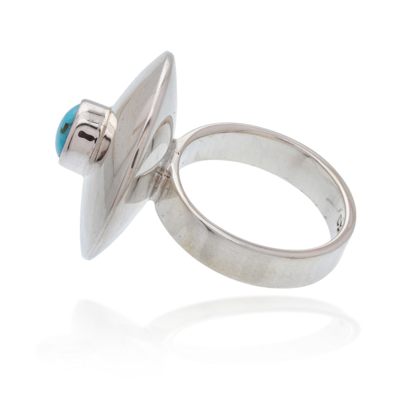 A disc of shining silver crowns this cocktail ring, set with natural blue-green turquoise in the center. Working with family members, Mexico's Alon Diller combines a modern sensibility with colonial aesthetics, inspired by the Taxco and Spanish cultures.