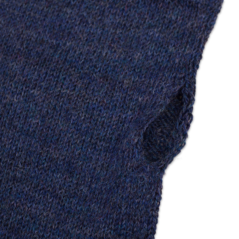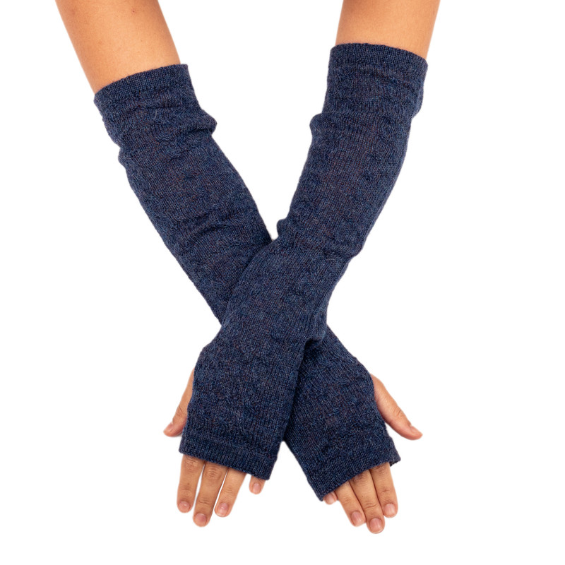 Backed by our 100% Happiness GuaranteeAlfredo Falcon of Peru designs a luxuriously soft pair of long fingerless mitts made of 100% baby alpaca, the fine fleece from the first shearing of the season. In a deep navy blue, the warm and cozy mitts feature a cable knit pattern.