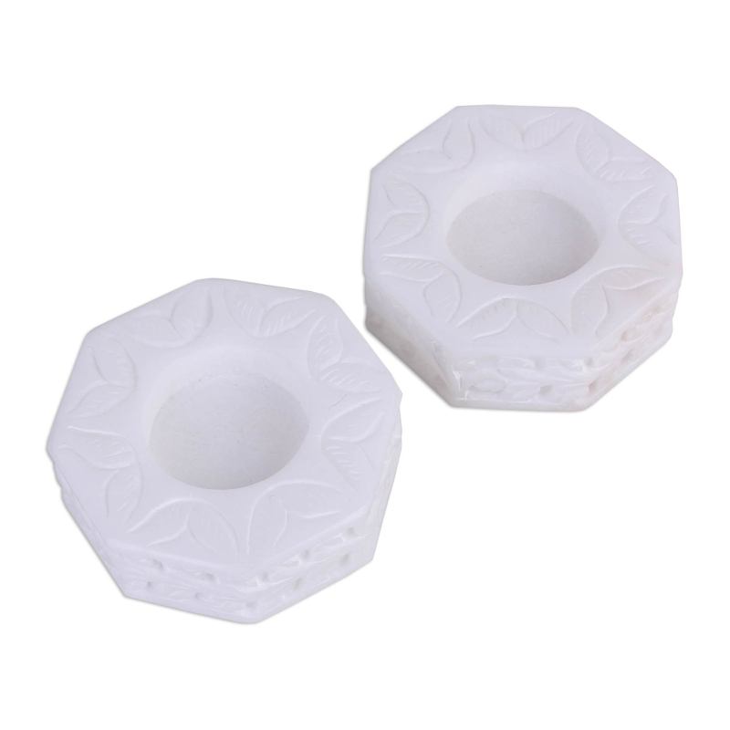 Elegantly crafted from white marble, this pair of octagonal tealight holders from Raj Kumari and Raja Ram of India provides functional and stylish decor for your home. The tealight holders feature an intricate engraving with a leafy vine motif along the sides and top of each piece. The sleek design with a touch of nature will look fabulous in a modern home.