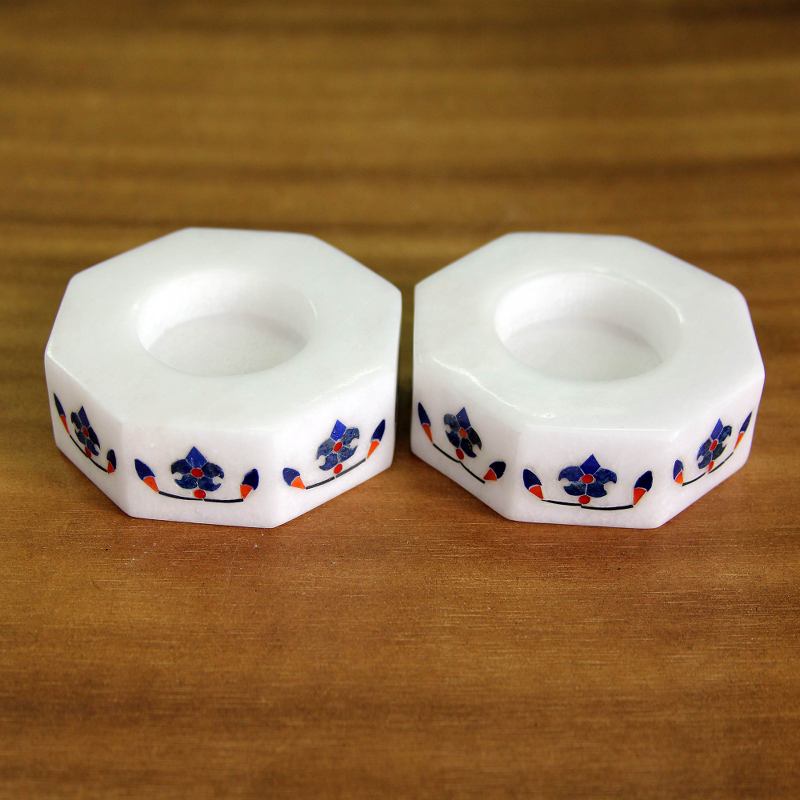Elegantly crafted from white marble, this pair of octagonal tealight holders from Raj Kumari and Raja Ram of India provides functional and stylish decor for your home. The two tealight holders feature a vibrant floral design that portrays the progression of a flower's growth. A blue flower is displayed at the center of each side, surrounded by two smaller buds. Deep orange and red accents add contrast against the white background.
