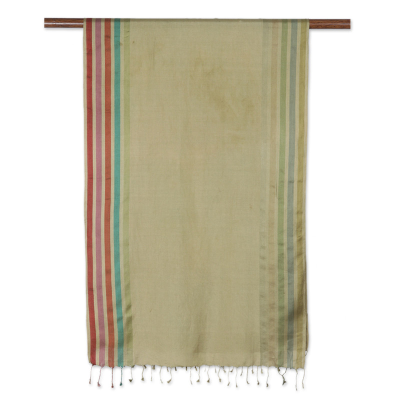 Delicate red, purple, blue, green, turquoise and brown stripes mark the sides of this stunning olive shawl hand-woven in India from 100% silk. Braving the cold or adding an air of sophistication to your looks will never be more glamorous than when wearing this design presented by Khitish.