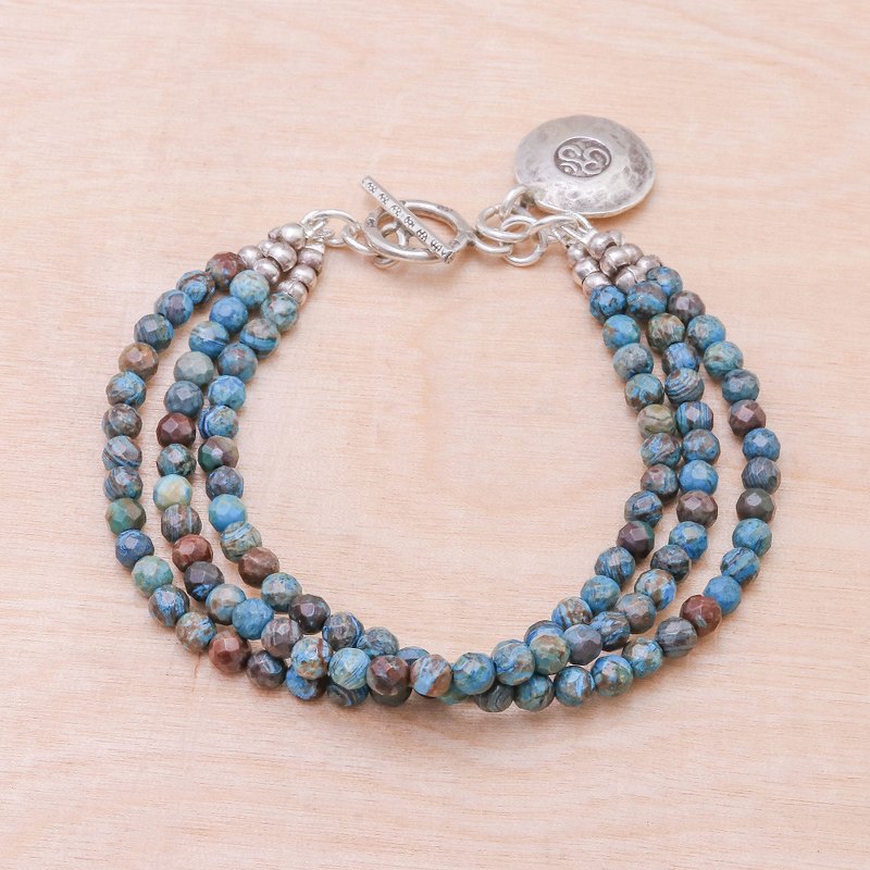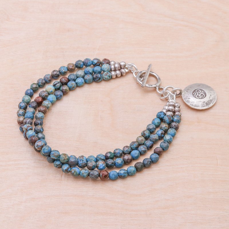Backed by our 100% Happiness GuaranteeResembling tiny planets in earthy shades of blue, green, and brown, jasper beads form three elegant strands in this bracelet by Thailand's Tipa. A 950 silver charm featuring the om symbol and a stamped Karen hill tribe toggle clasp add meaningful detail. This piece beautifully blends natural artistry with spiritual charm.