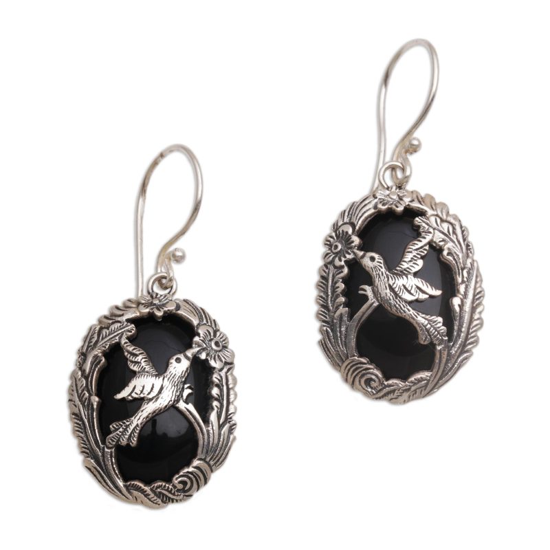 Exploring themes of freedom, Rupadana designs these dangle earrings to depict birds among a lush, floral garden. The tranquil scene is handcrafted in sterling silver over cabochon ovals of dark onyx. The Balinese earrings bring boldness and beauty to the wearer.