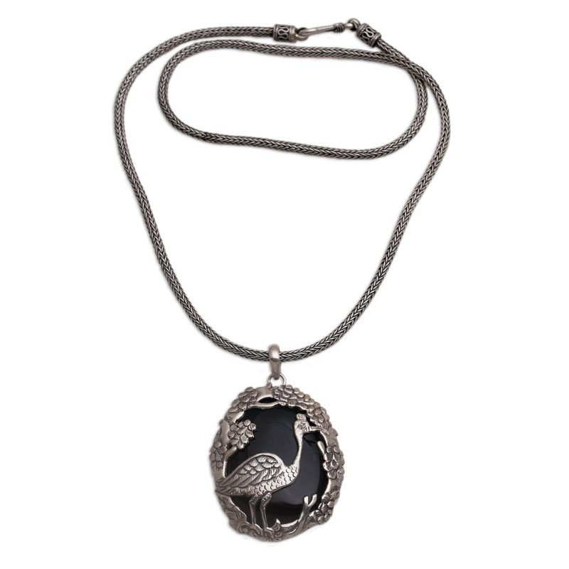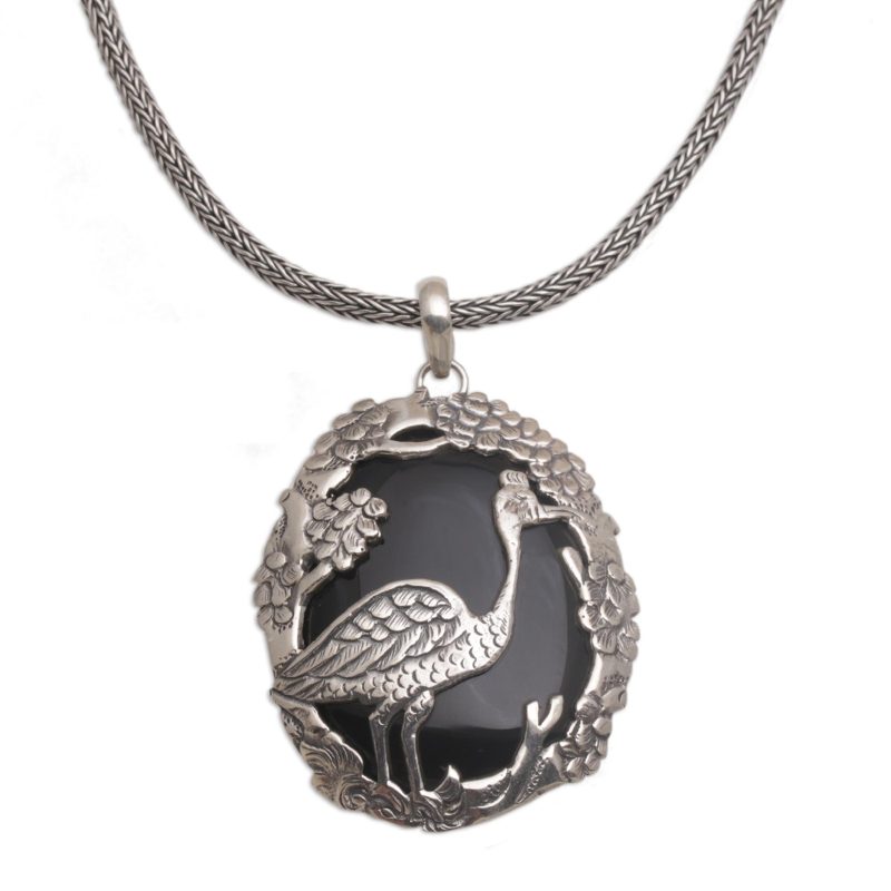 A majestic mother heron among a verdant jungle is captured in sterling silver openwork over an oval stone of black onyx. Designed by Bali's Rupadana, this pendant necklace captures the beauty of nature, adorning the neck on Naga chain.