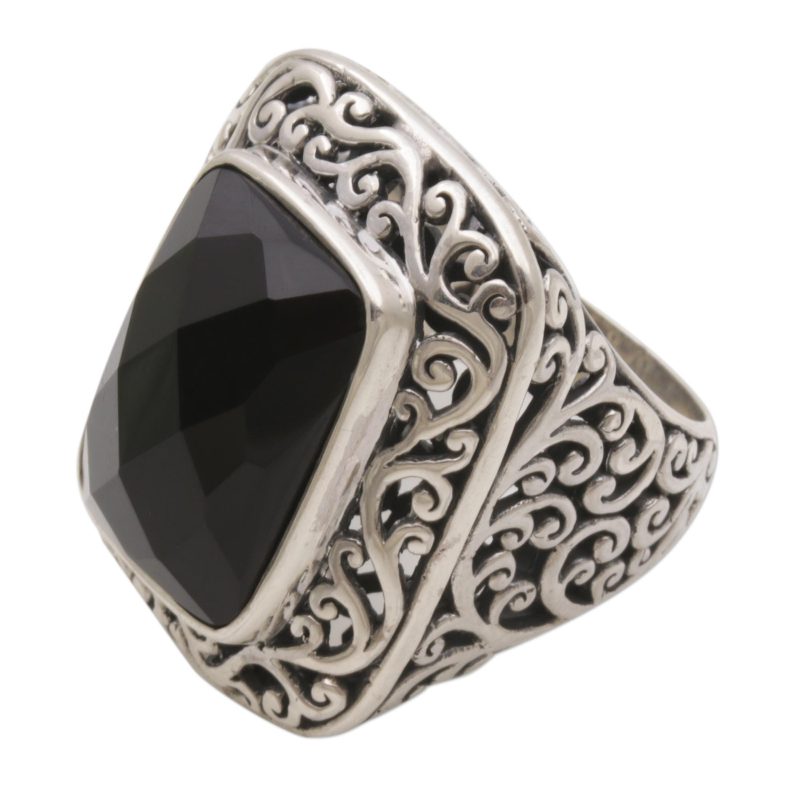 Weighing over 14 carats, a stone of faceted black onyx is featured in the crown of this Balinese cocktail ring, designed by Made Sudiari. The ring is handcrafted of sterling silver by local artisans with elegant openwork spiral motifs surrounding the stone and adorning the tapered band.