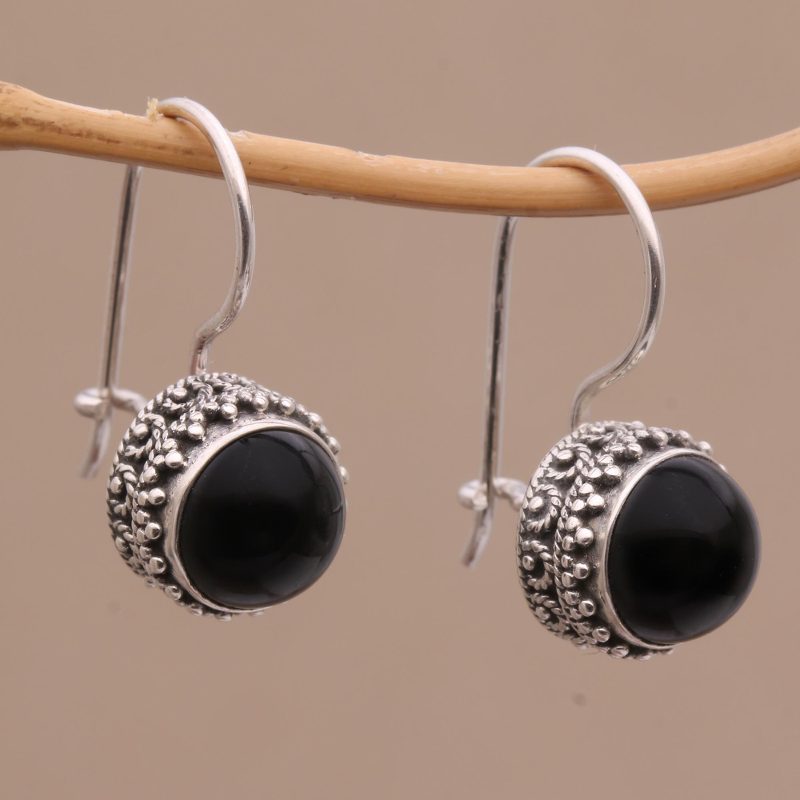 This beautiful pair of drop earrings come from artisan Rupadana who is inspired by traditional Balinese motifs in his design. Each sterling silver earring features a smooth round cabochon of onyx that shimmers with mystical wonder from within a bezel setting. Intricate jawan dots and swirling rope motifs adorn the sides of the earrings, enhanced through oxidization.