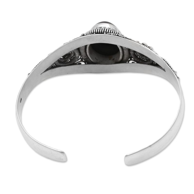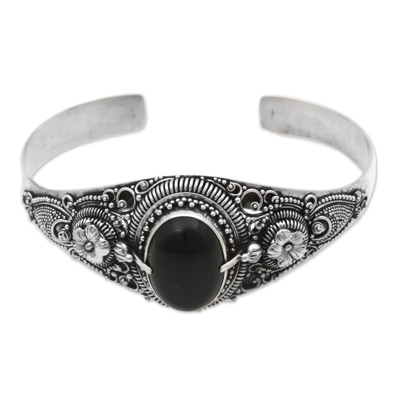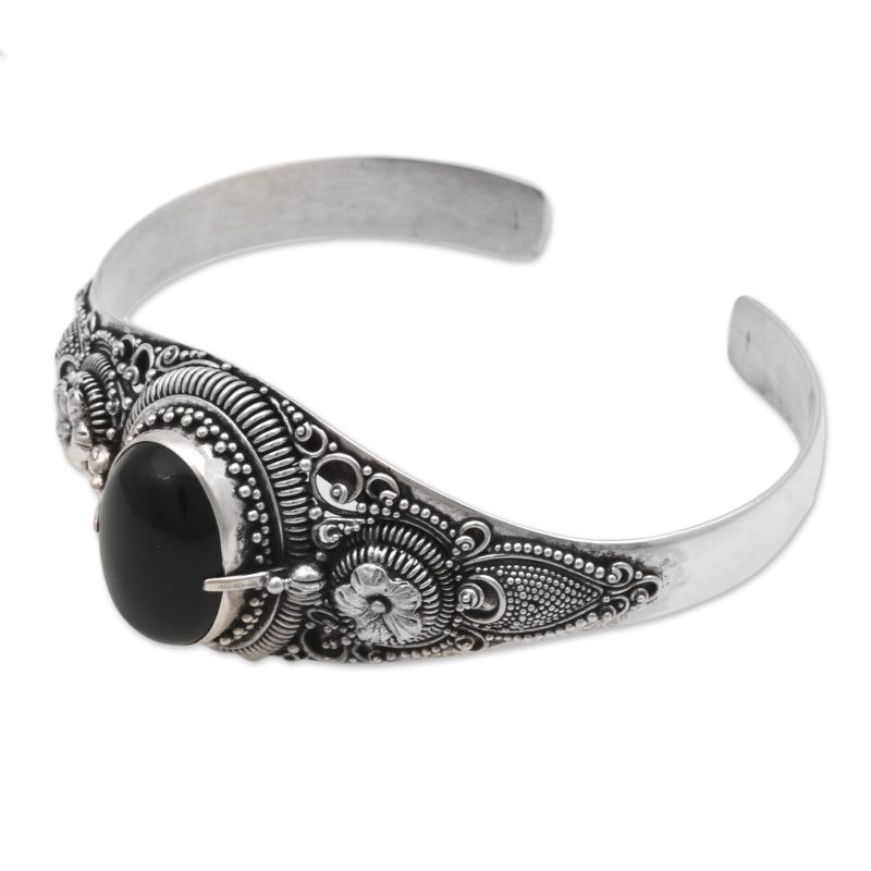 Featuring exquisite floral patterns, this dazzling cuff bracelet by Komang Suastra reflects the tropical beauty of Bali's Sindu beach. An oval of black onyx rests at the center of the ornate front panel, adding a sophisticated vibe to the bracelet's design.