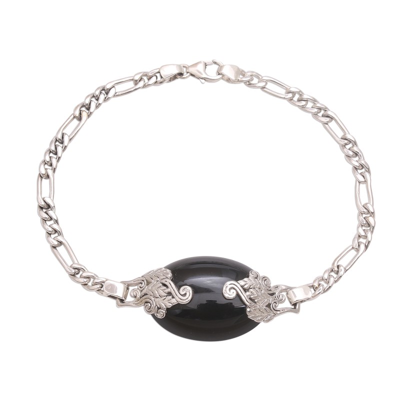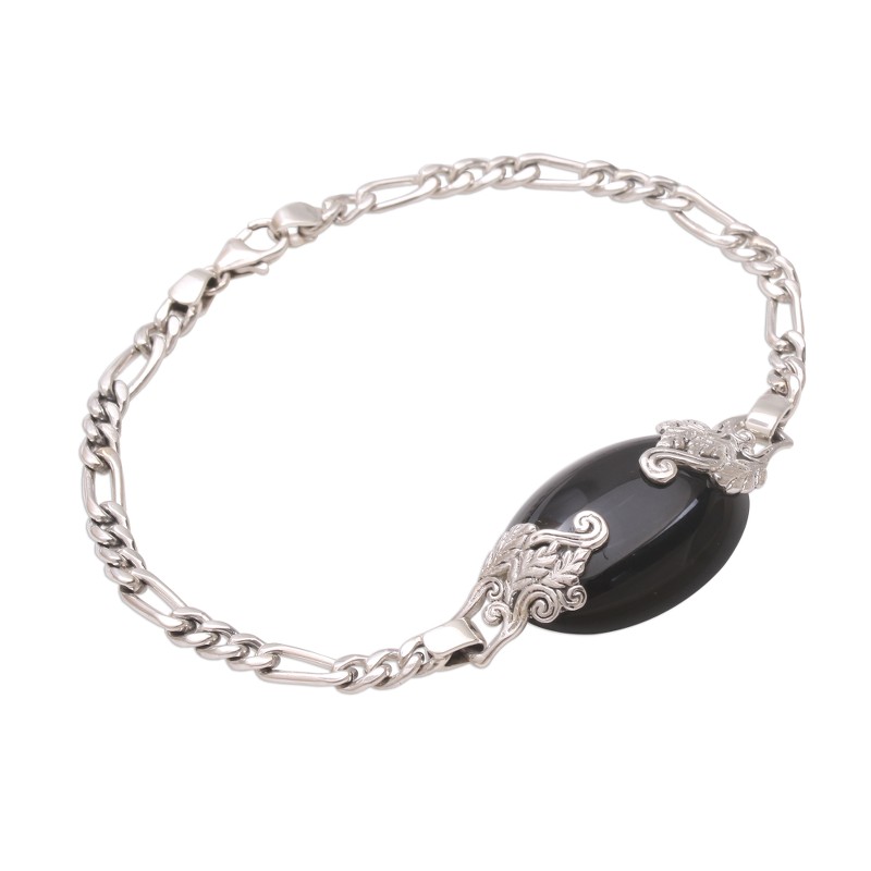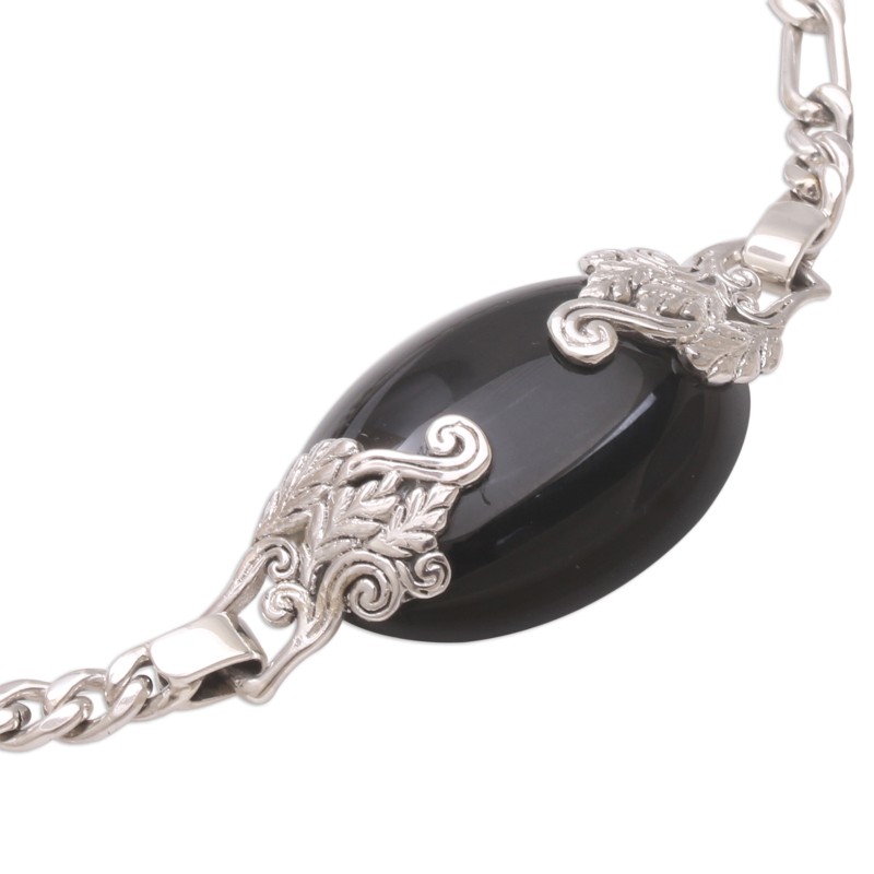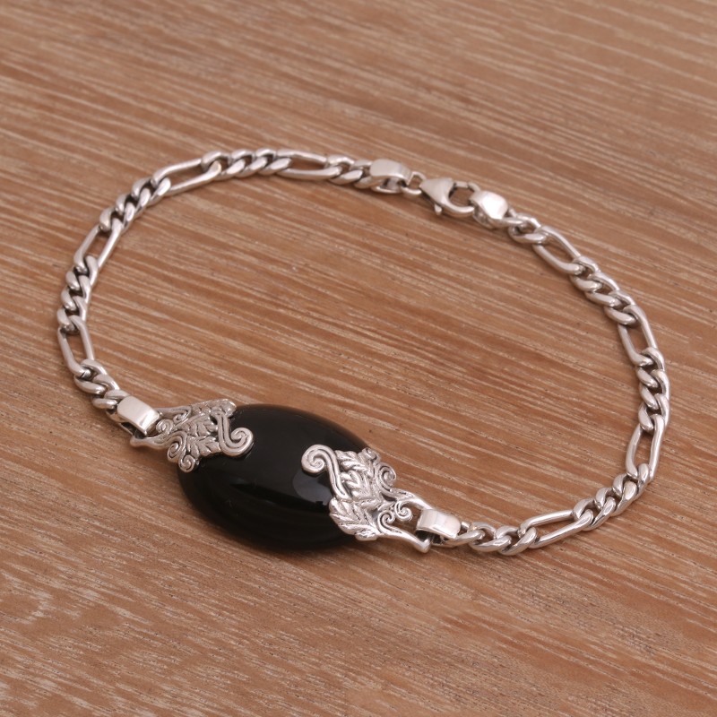 A gorgeous cabochon of onyx glistens magically in this pendant bracelet from Bali. Artisan Wayan Lasti centers the sterling silver chain with the mesmerizing gemstone, which is embraced by intricate leafy motifs. Black onyx gemstones are traditionally known to be gifted on a 10th wedding anniversary, and are believed by some to offer protection.