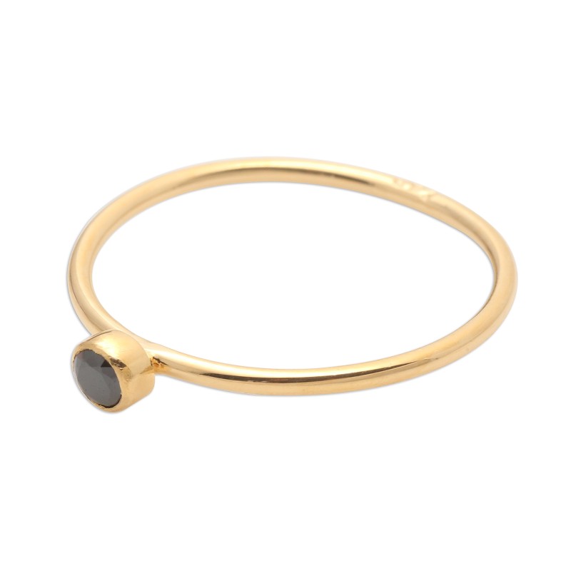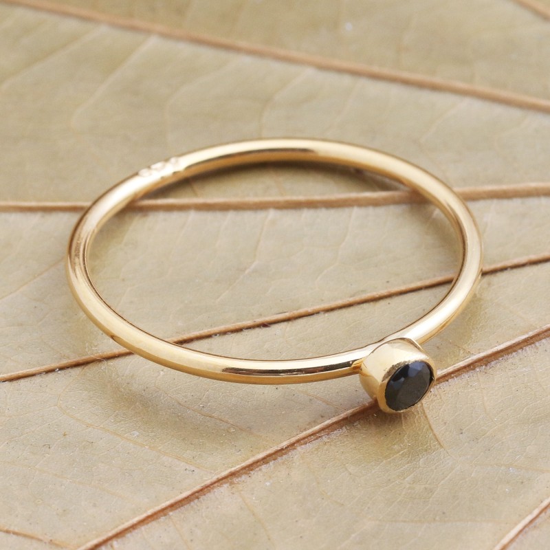 Dainty and subtle, this solitaire ring is designed by Bali's Ketut Sulastri. The slender 18k gold plated sterling silver ring hosts a petite faceted black onyx in a bezel setting.