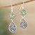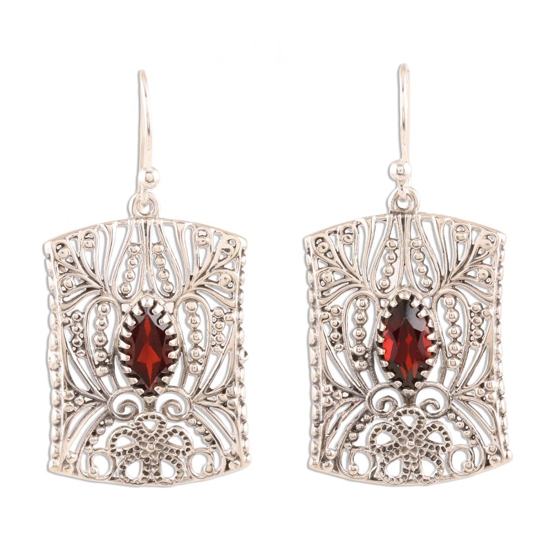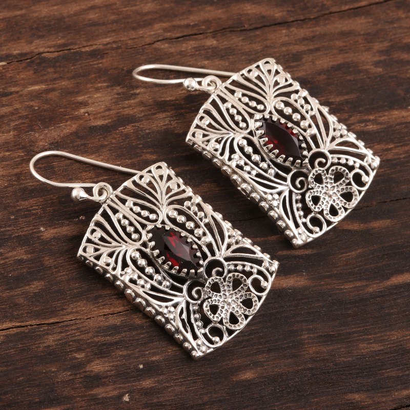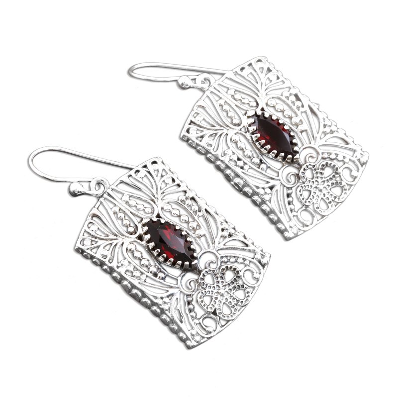 Framed by a variety of gorgeous openwork patterns in sterling silver, two marquise garnet gemstones are the focal points of these Indian dangle earrings. Rakesh Rana creates this fascinating accessory.