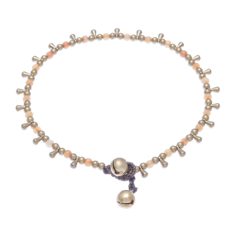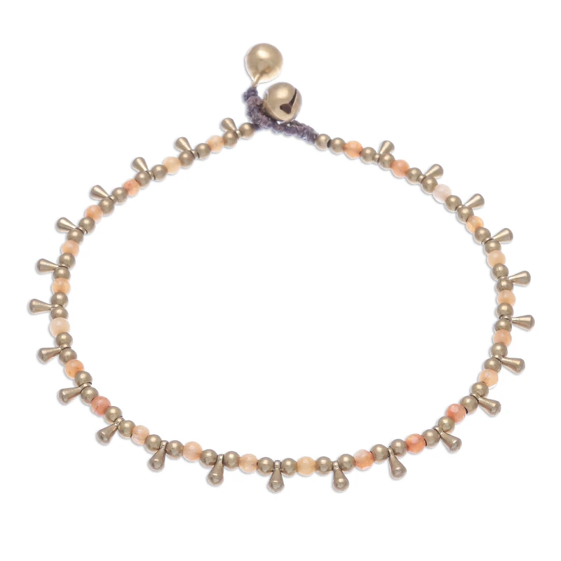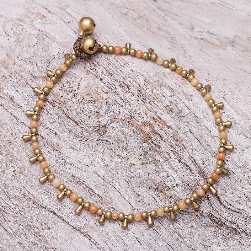 Beads of orange quartz are displayed alongside dangling brass beads in this bohemian anklet from Thailand. Tiraphan Hasub designs and crafts this anklet, closing it with a ringing brass bell button clasp.