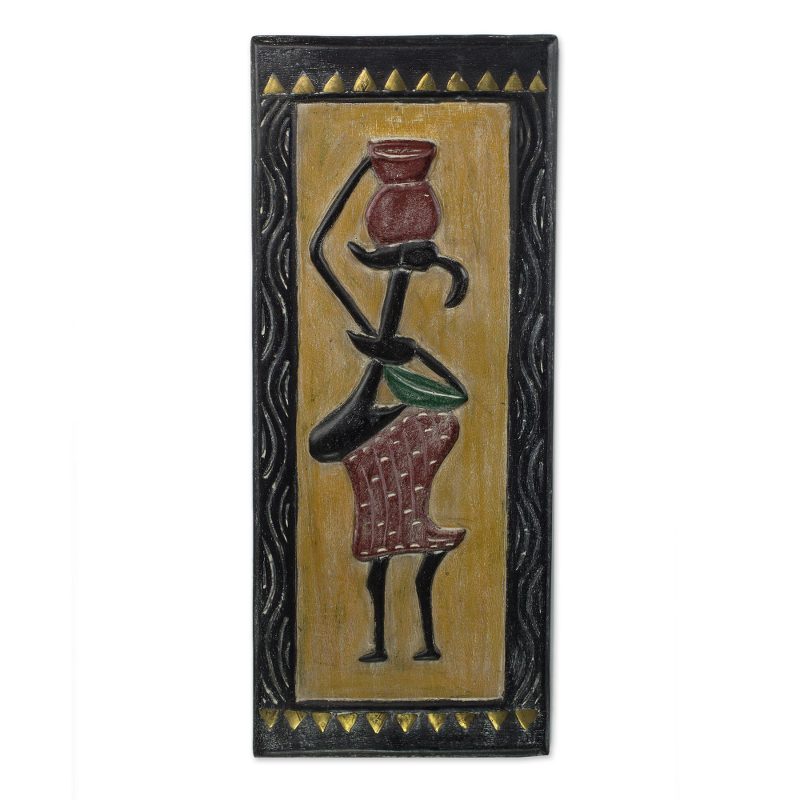 Backed by our 100% Happiness GuaranteeA pregnant woman works hard as she carries a pot upon her head in this splendid original wall accent by West African artisan Musah Abdallah. The plaque is hand-carved from sese wood and painted in bright eye-catching colors. Brass triangles are set along the top and bottom borders of the plaque.