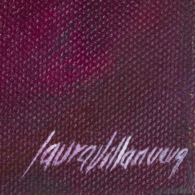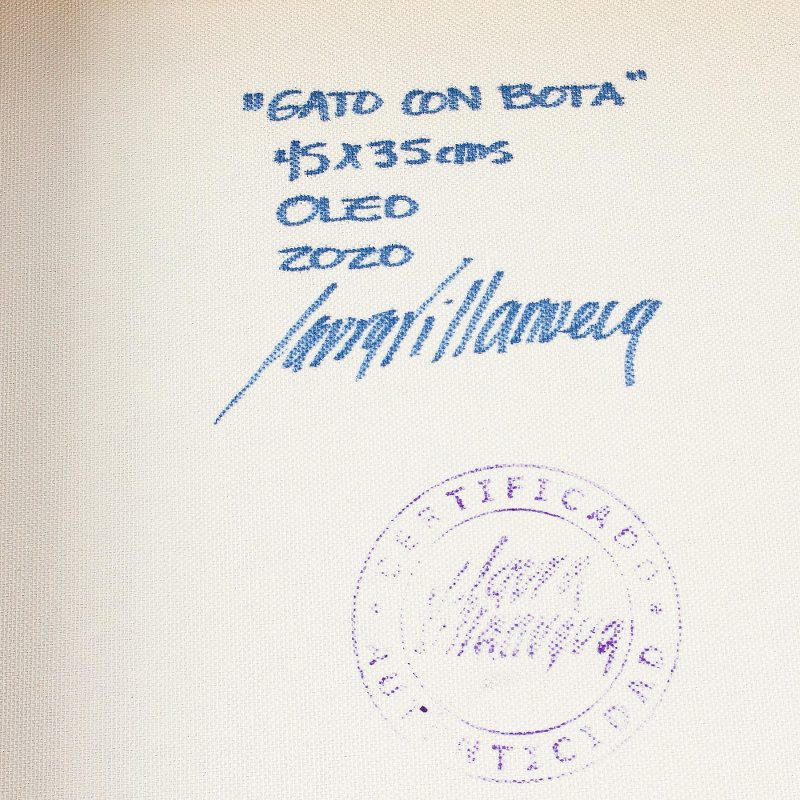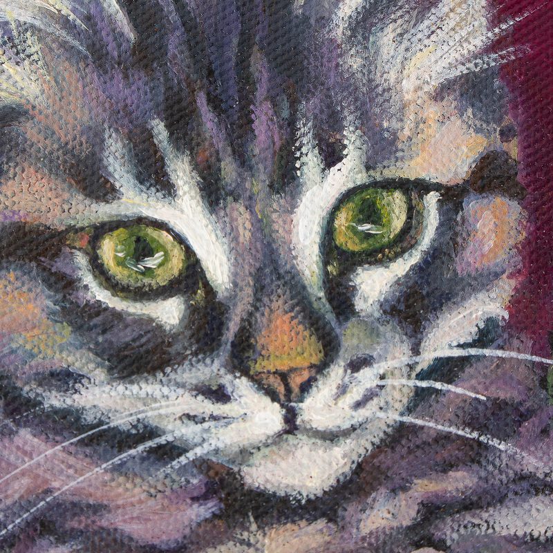 Working in oils and acrylics on canvas, artist Laura Villanueva creates this charming painting. The original artwork depicts a bright-eyed cat emerging from a Victorian-style ladies' boot. Feathers like tiny angel wings rest on the cat's shoulders.