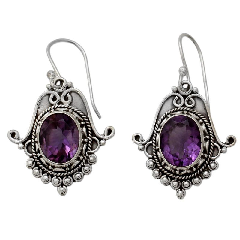 Backed by our 100% Happiness GuaranteeThe bold beauty of checkerboard-faceted amethyst is mesmerizing in these glamorous earrings from Aparna in India. The earrings are crafted from sterling silver with intricate wire and beading surrounding the gems. The rich purple amethysts total five carats.