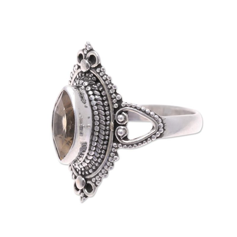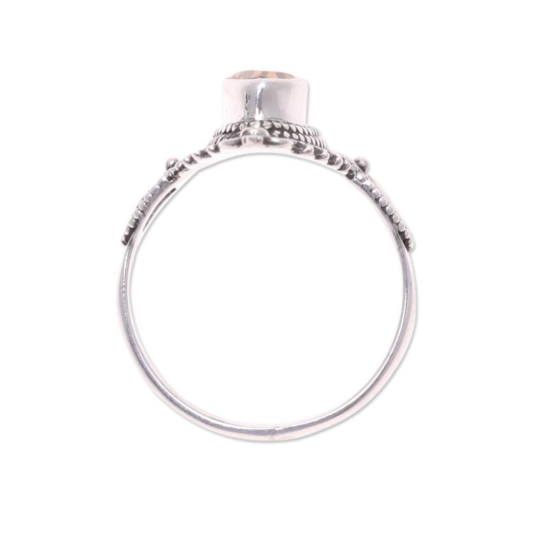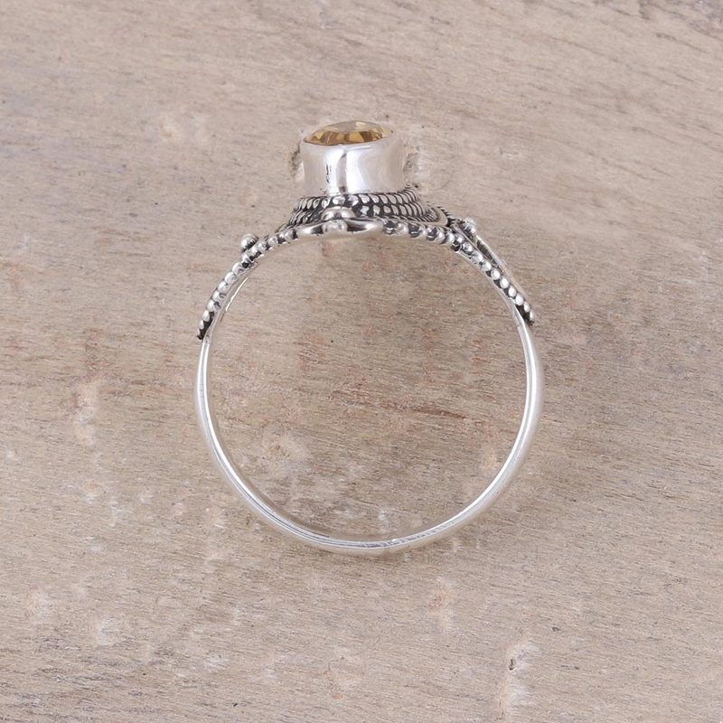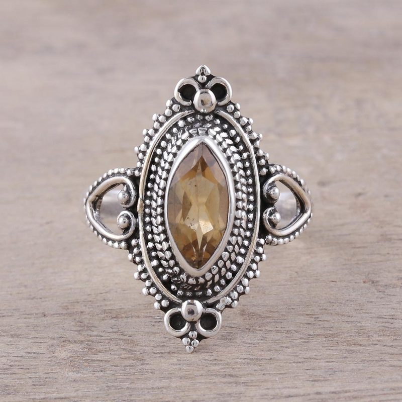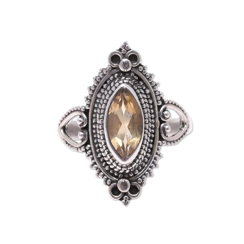Indian artisan Babun Dey crafts a ring that pays homage to the life sustaining sun. A faceted marquise citrine dazzles in the sunlight, framed by an ornate sterling silver bezel. Citrine is believed to to stimulate happiness and creativity.