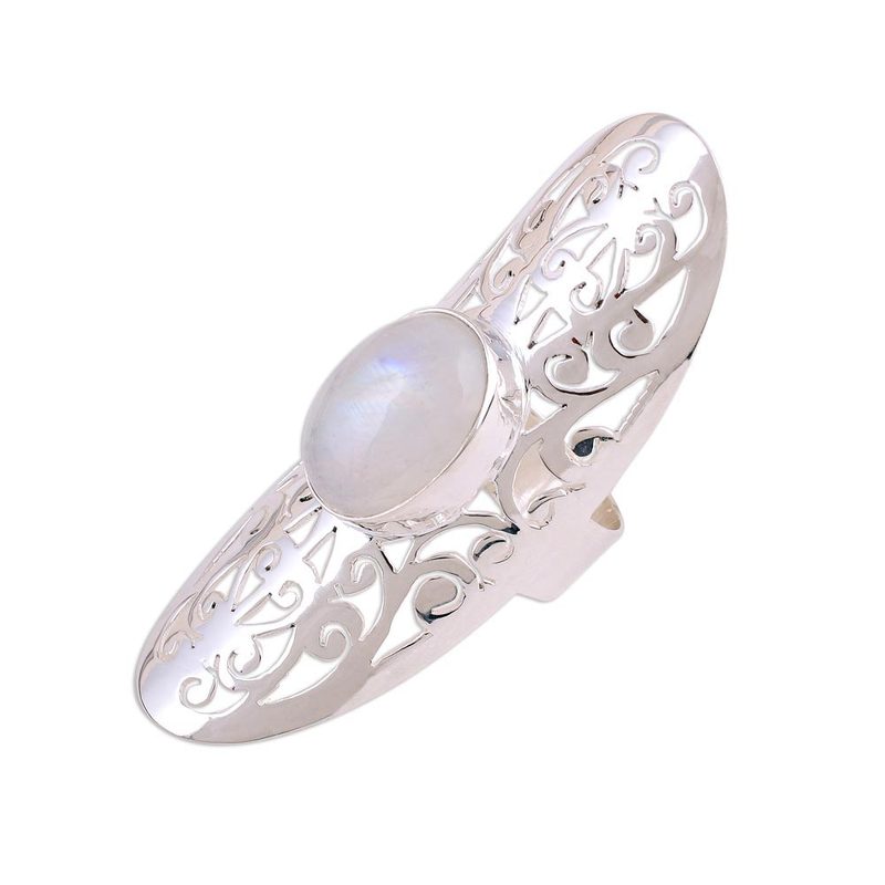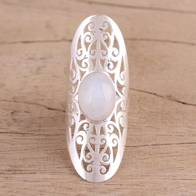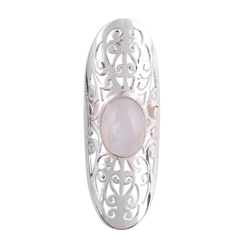 Spectacular in sterling silver, this ornate cocktail ring reveals the artistry of India's jali, or cutout work. Misty moonstone centers the elongated crown, bringing its own allure to a stunning design from Alok Jain.
