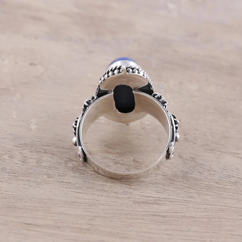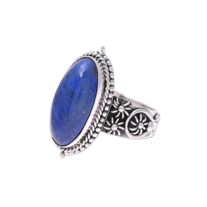 Backed by our 100% Happiness GuaranteeThis beautiful cocktail ring features a large, smooth, oval cabochon of lapis lazuli ringed in a sterling silver rope and dot motif setting. Wire work in sterling silver adds further details, such as flowers each side of the band. This gorgeous cocktail ring is presented by Aparna of India.