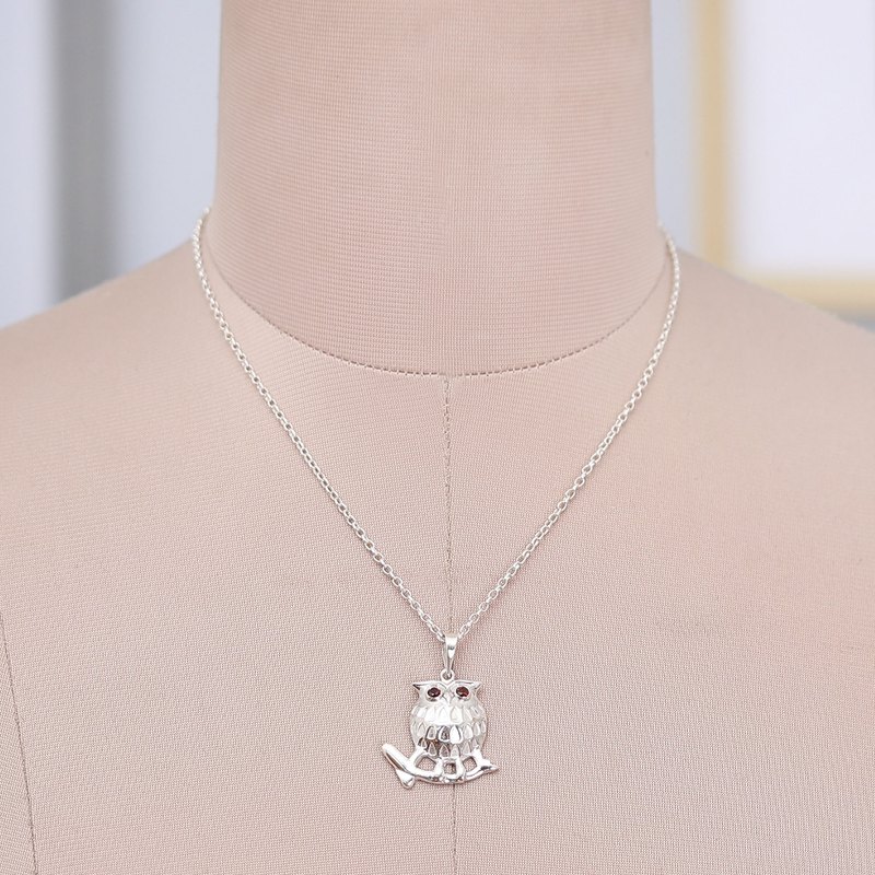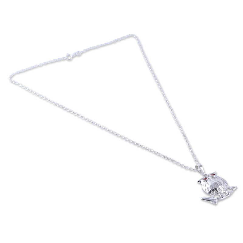 An omen of passion shines in the eyes of this stunning owl pendant, crafted by master artisans of the Indian region. Shanker's sterling silver necklace spreads an aura of mystery and romance in each of its charming details, combining polished and textured finishes. Natural garnet stones, faceted and cut in a round shape, add the final touch through crimson light.