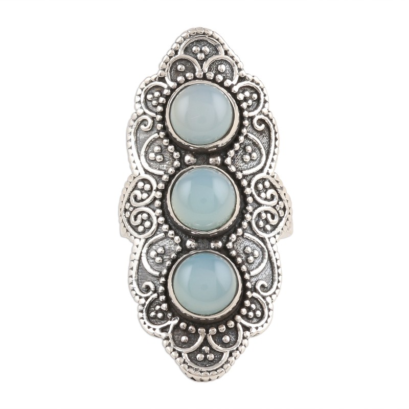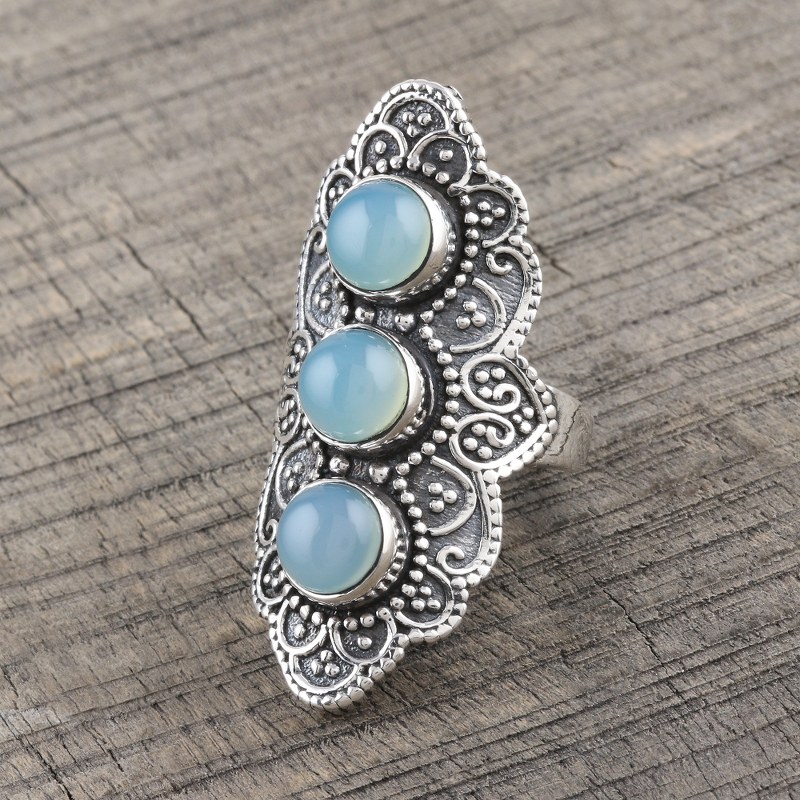 You can find our chalcedony cocktail ring 'Goddess Trio' by Shivani Choudhary in jewelry categories such as Bohemian Rings, Gemstone Rings, Chalcedony Rings, Silver Rings and Sterling Silver Rings. Enjoy exploring these sections for other Novica treasures.