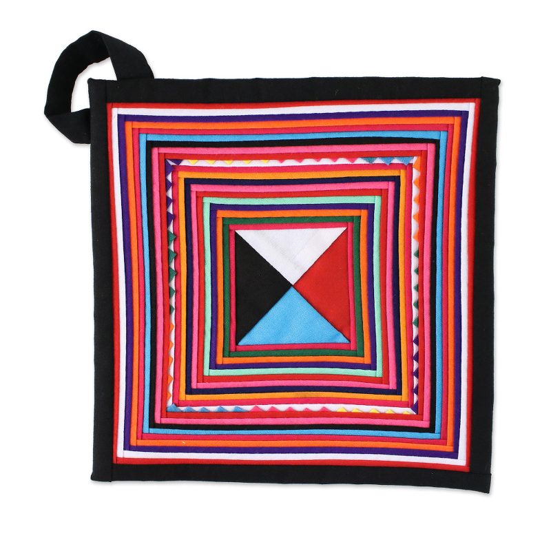 Displaying a rainbow of colors with black borders, these square trivets bring the beauty of Lahu hill tribe handicrafts to any home. Presented by Thai Tribal Crafts, this pair is perfect for simple decor or casual use. Each trivet features a loop for hanging from a hook.