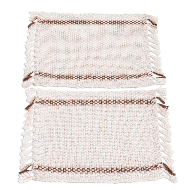 Serve tea, coffee and your favorite beverages with sophistication thanks to this pair of elegant coasters expertly hand-woven from cotton in El Salvador. Designed by Margarita Lainez, these accessories feature lovely fringes on the ends and discreet checkered motifs in brown, all on a gorgeous ivory base hue.