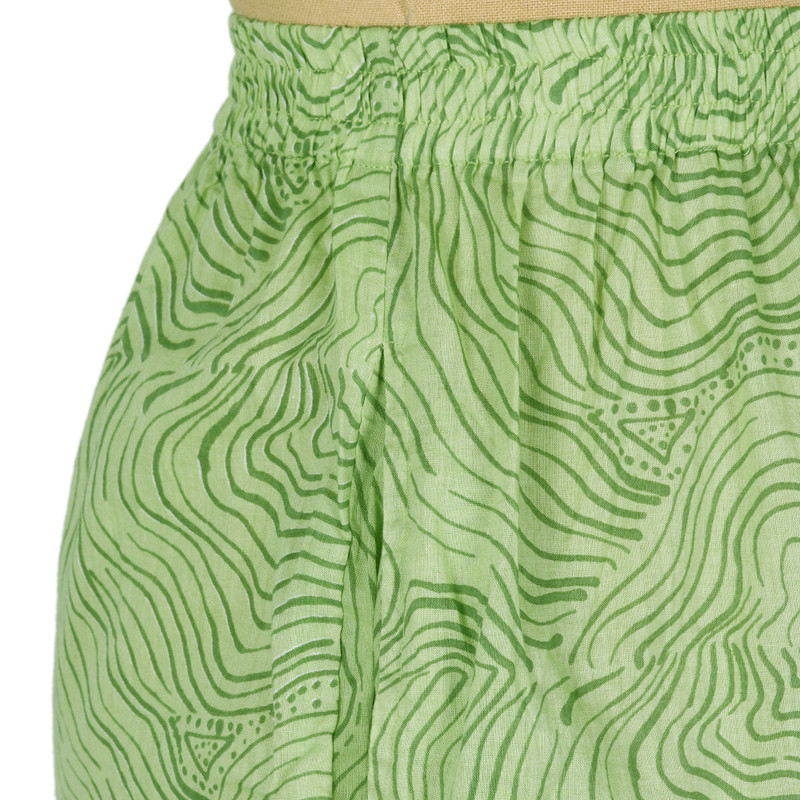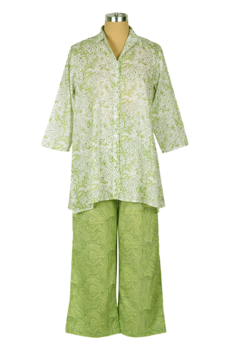 India's Aftab draws inspiration from the freshness of spring to create this comfortable cotton pajama set. The collared blouse has a longer length body and three-quarter sleeves, printed with large olive colored paisleys on a white base. The elastic waist pants are printed with a light olive and avocado faux-bois all over pattern and finished with side seam pockets.
