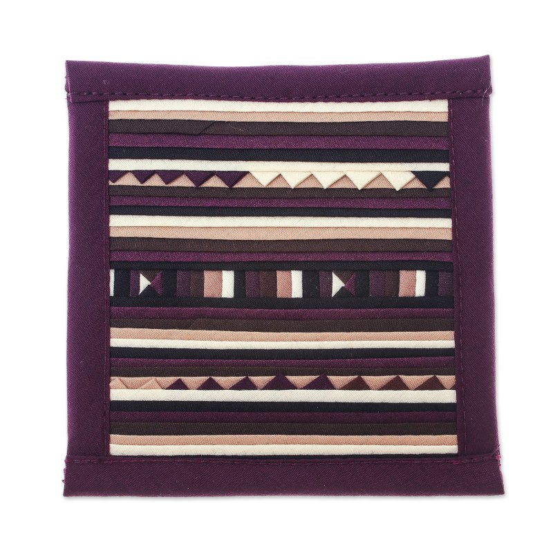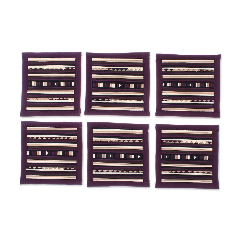 Handcrafted in the style of Thailand's Lahu people, geometric motifs appear in neutral cotton patchwork with purple borders. Artisans from Thai Tribal Crafts create this beautiful set of six coasters. Lahu women often augment their family's income with textile crafts, including this type of patchwork appliqué.