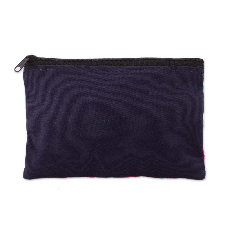 Peruvian artist Maria Ramos Sanchez crafts a charming cosmetic bag whose scene transports us directly to the Andes on a calm, sunny day. Small homes nestled among trees and flowers accompany grazing alpacas, while a single cloud and a flock of birds float overhead. The applique case with embroidered details is lined in solid black, and the reverse side is black.