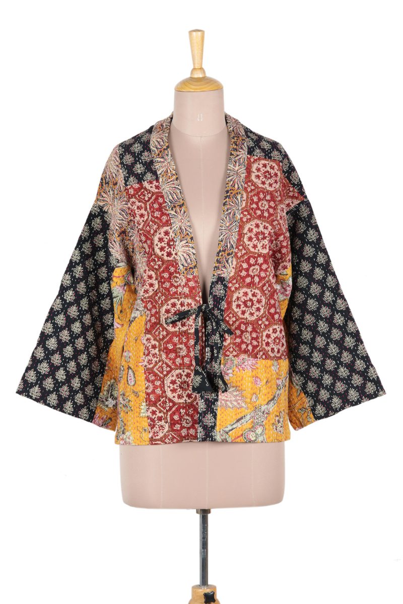 A mixed-print patchwork and kantha embroidery lend a wonderfully bohemian attitude to this kimono-style jacket. Crafted of all cotton, the jacket features a front tie and flared sleeves. Designer Jay Kumar Maheshwari presents the jacket, which is crafted by local artisans in Jaipur, India.