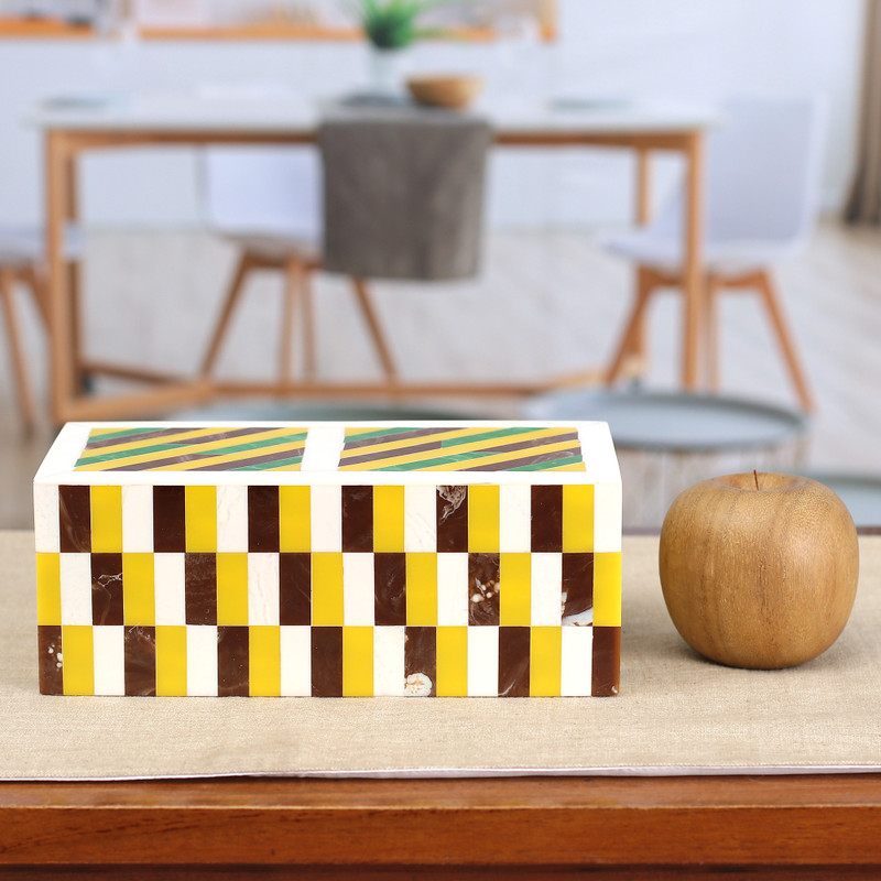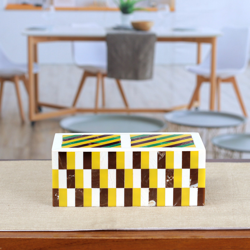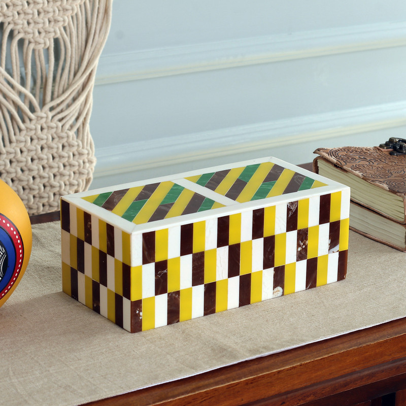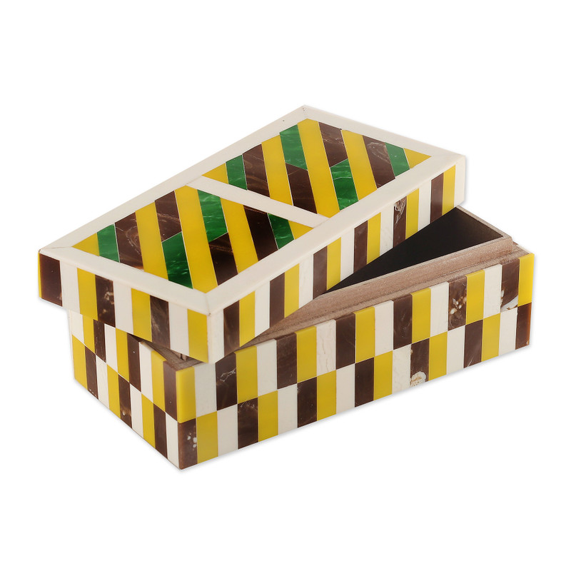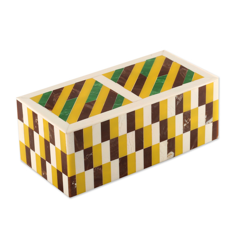 Squares and lines invite you to add bold elegance to your spaces. Boasting a palette of yellow, brown and green hues, Kamal's resin box arrives from distant Indian lands to add a creative touch to your interiors while providing a convenient design. With a smooth surface, the piece also has a sturdy interior wood structure.