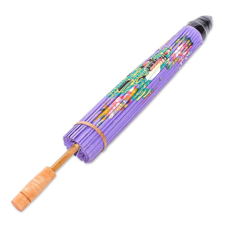 Against a background of solid violet, a majestic peacock is surrounded by lush floral motifs. Thai artisan Nikom designs this parasol, crafted from paper and painted by hand. Featuring a bamboo frame and handle, this parasol is perfect for casual use in the sun or for home decor.
