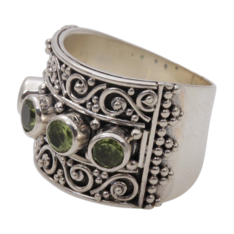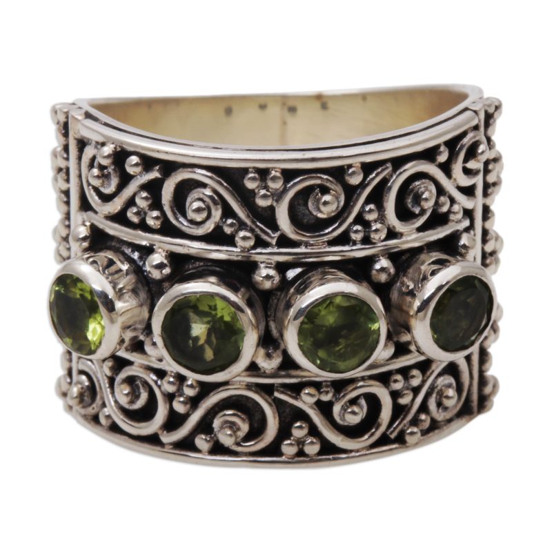 Four stones of sparkling green peridot are featured at the front of this cocktail ring from Bali, flanked by elegant spiral and dot motifs with a combination of finishes. Designed by Buana, this cocktail ring makes a wonderful companion wherever it goes.