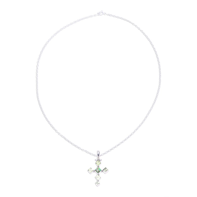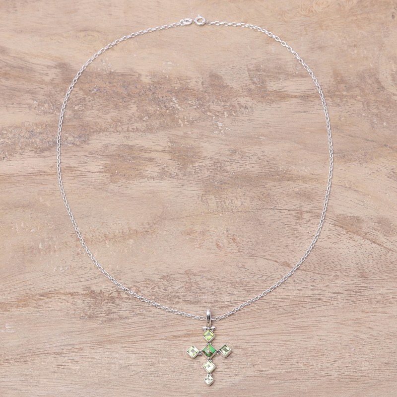 Evoking the beautiful sweet green of new leaves, five faceted peridot gemstones surround a square of green-toned composite turquoise set in sterling silver in this cross pendant necklace. Shanker of India designs this lovely handcrafted necklace.