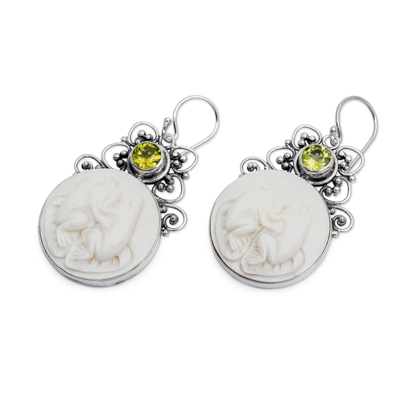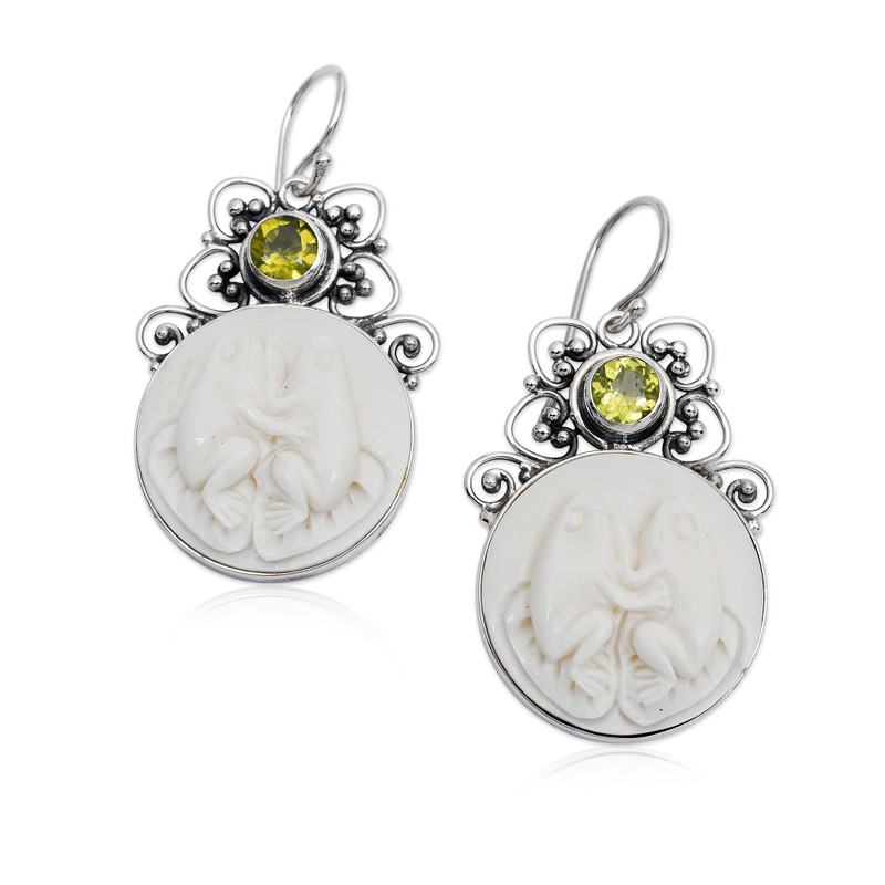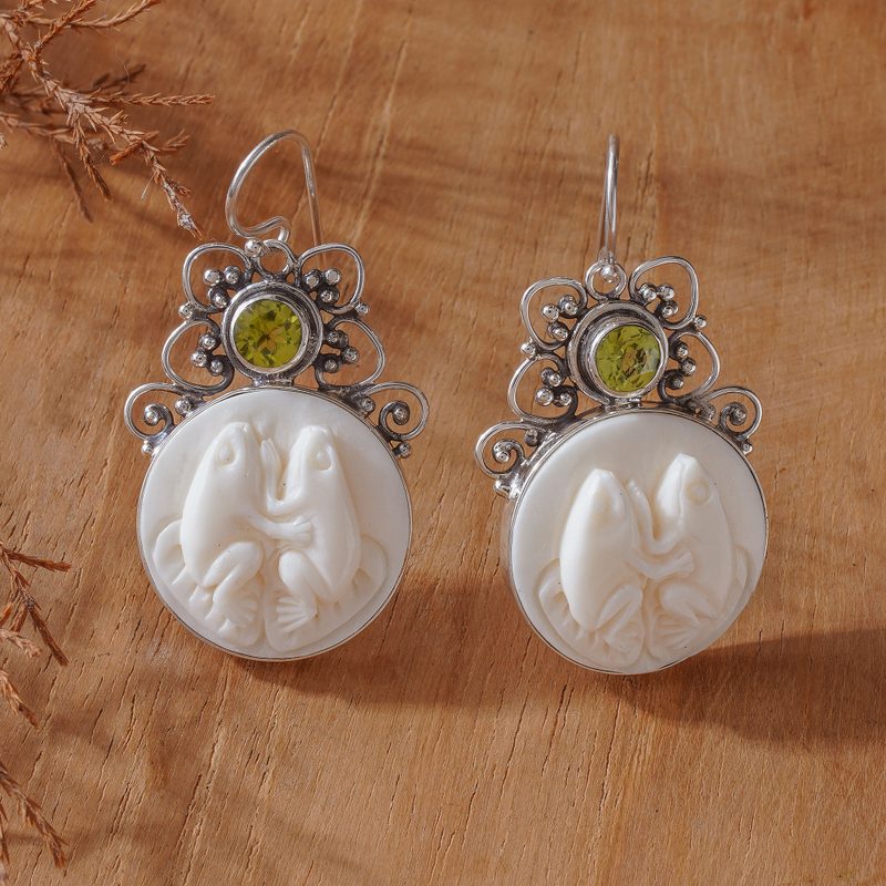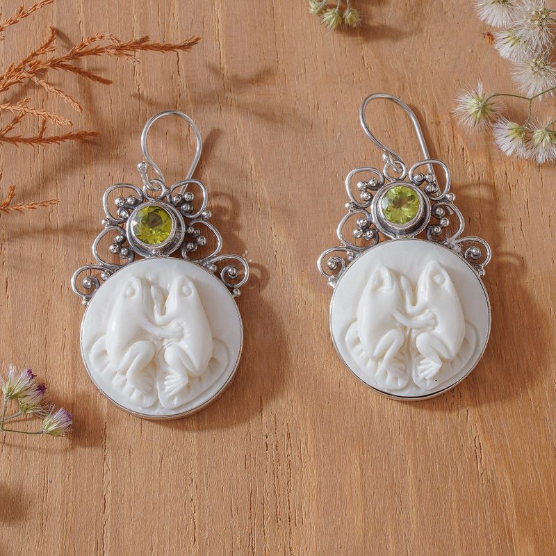 Framed by sterling silver, croaking frogs are hand-carved of bone to dangle from the ears. These Balinese earrings are designed by Made Wardika. He accents them with one carat of natural peridot stones.