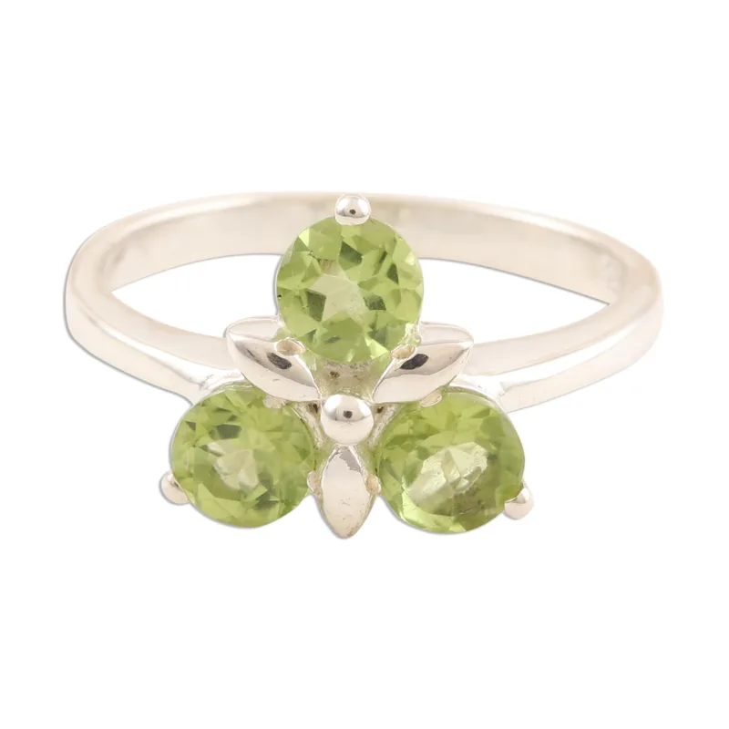 Backed by our 100% Happiness GuaranteeThe allure of the August birthstone is captured in this three-stone ring presented by India's Chintan. A gently tapered sterling silver band cradles prong-set natural peridots, faceted to capture and reflect light.