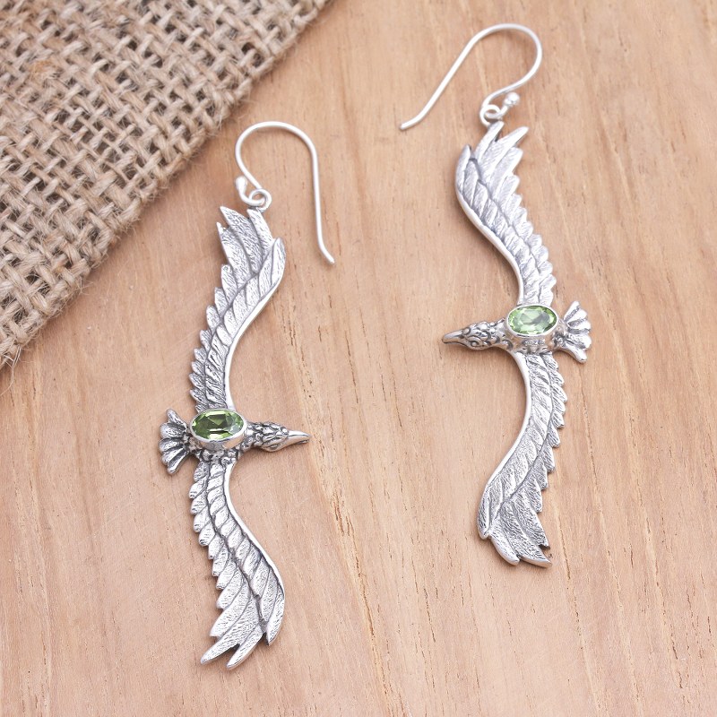 Backed by our 100% Happiness GuaranteeDotted with spring green stones, Nyoman Rena's eagle earrings soar through the air. The Balinese artisan hand crafts each earring from sterling silver, engraving the precious metal with feather-like details. Along the eagle's back, a faceted peridot gem twinkles.