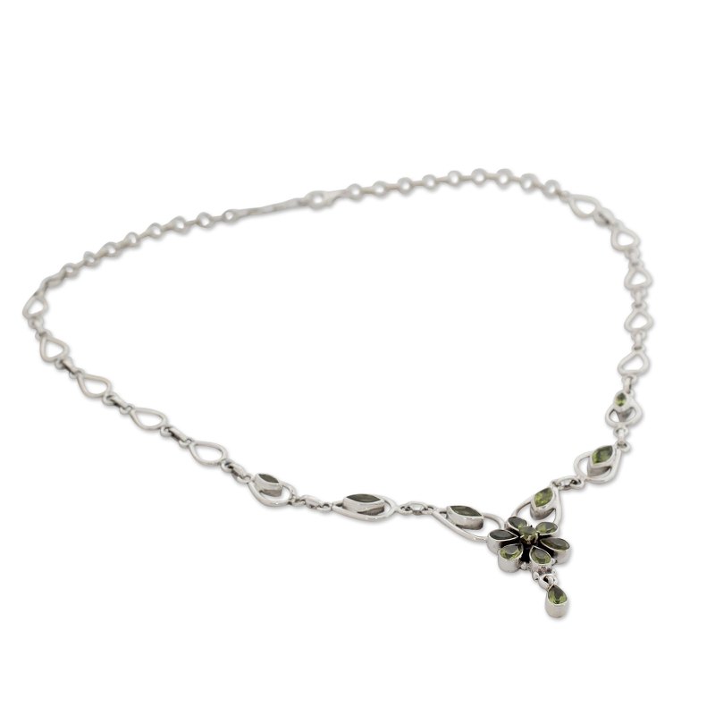 Petals of faceted peridot, the birthstone of Augusts, bring sparkle to fresh daisies. Crafted of sterling silver, the blossoms hold a teardrop stone that dances beneath it. This charming necklace is designed by India's Neeru Goel to showcase 11.5 gemstone carats.