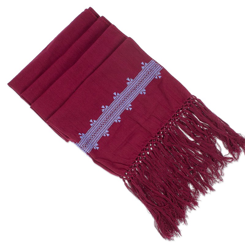 From the traditional lands of Mexico, Petrona Patishtan shows the world the elegant style of the region. After a long process that involves talent and expertise, the final result is a handloomed cotton shawl in a burgundy hue with a glamorous vibe. The accessory also features classic embroidery details on each end, all in a periwinkle tone that enhances the fringes dangling gracefully from the design.