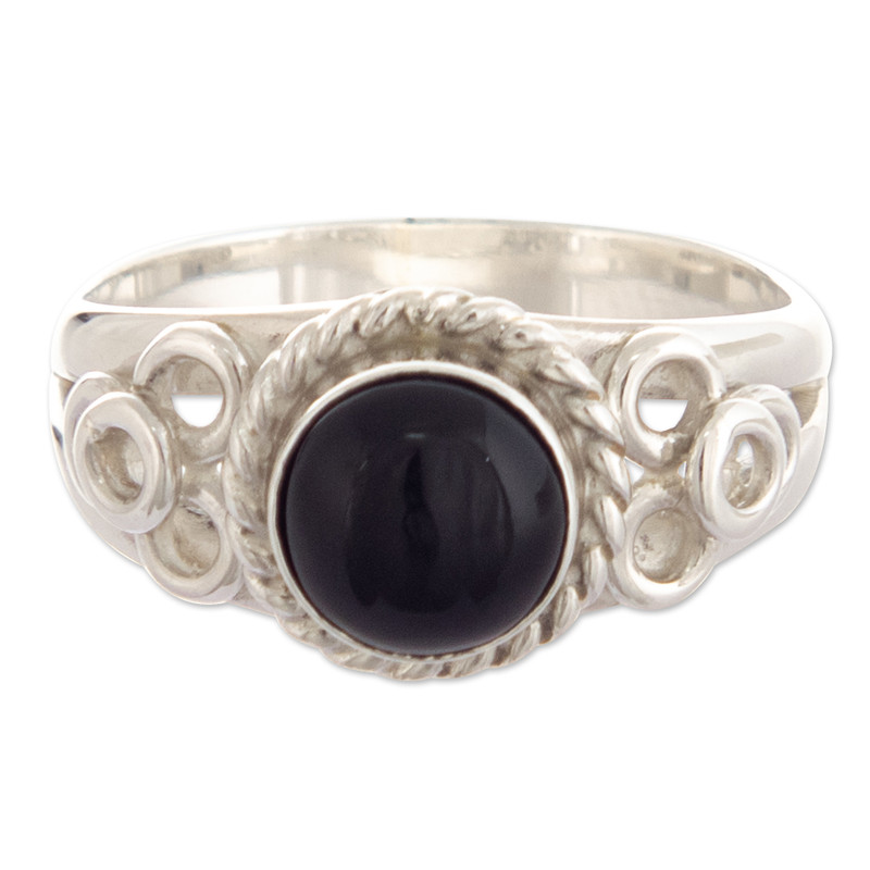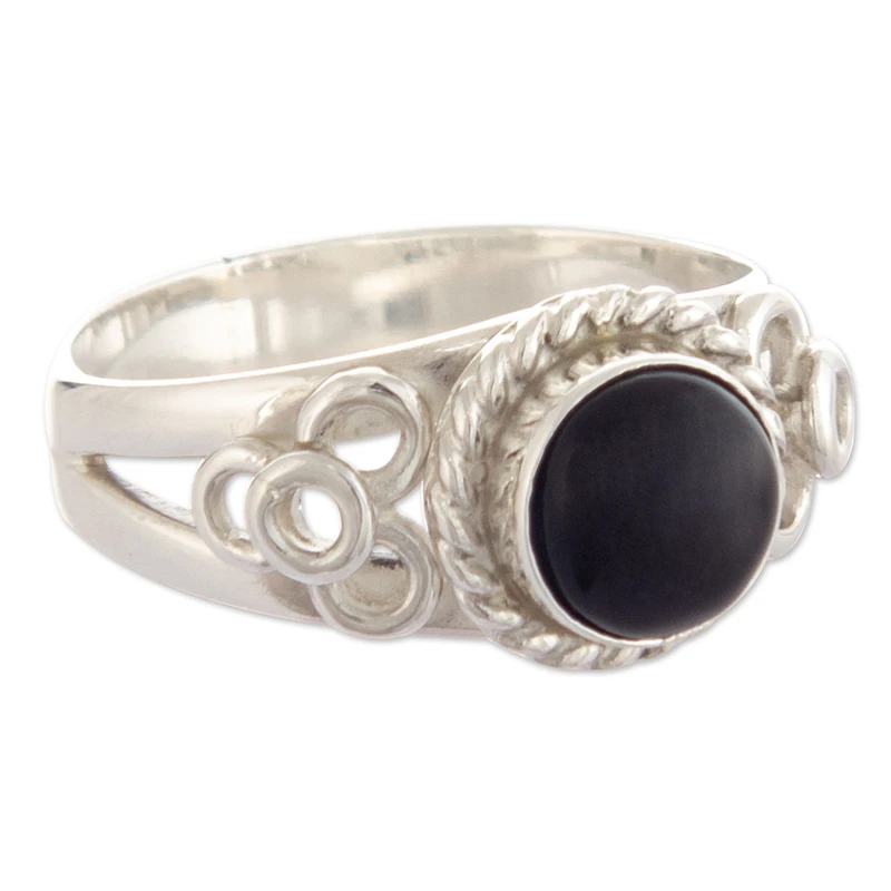 Exalting the beauty of natural obsidian, Carmen Granados displays a polished gemstone hemisphere in this design. Spiral rope motifs surround the sleek black cabochon, and clusters of rings in Andean silver complete the handcrafted cocktail ring.